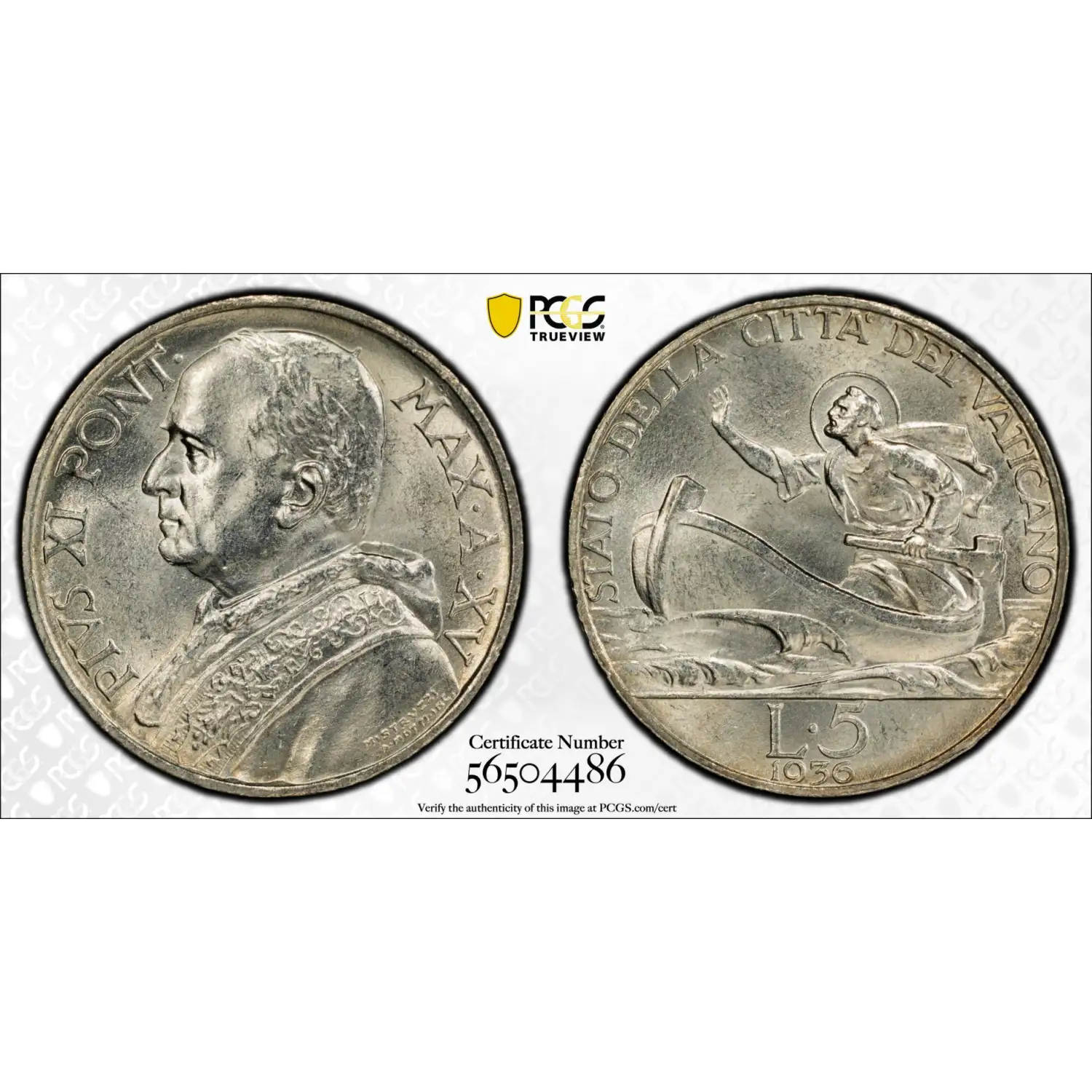 1936 VATICAN CITY Silver 5 LIRE PCGS MS-64 Anno XV