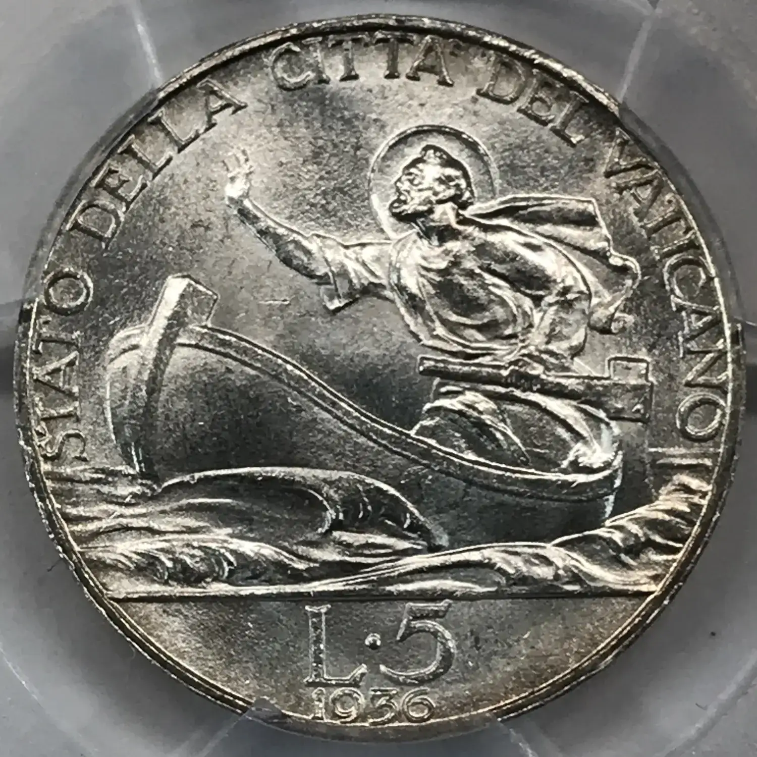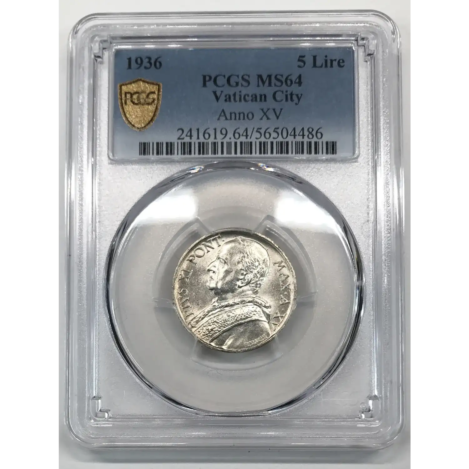 1936 (Anno XV) VATICAN CITY Silver 5 LIRE PCGS MS-64 - Pius XI - KM#7