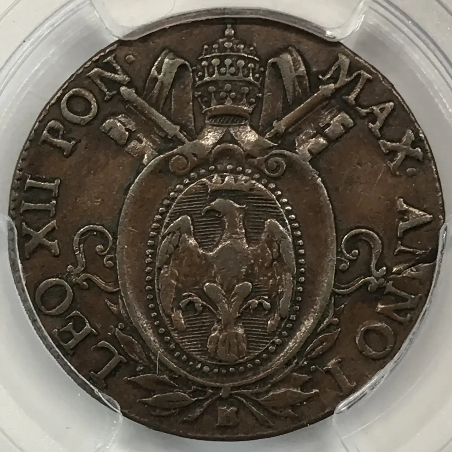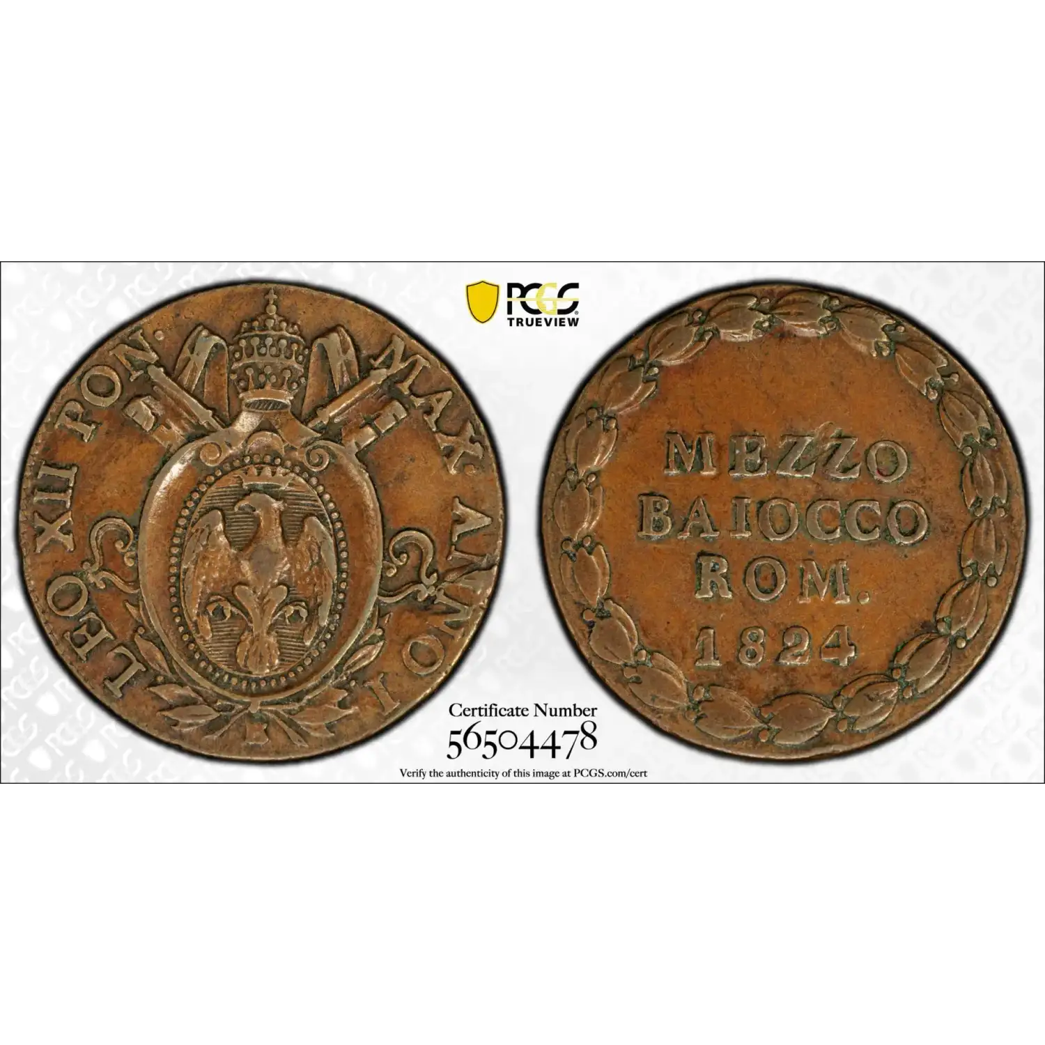 1824-B ITALIAN STATES Copper MEZZO (1/2 Baiocco) PCGS AU-50 BN - Leo XII Anno I - KM#1295