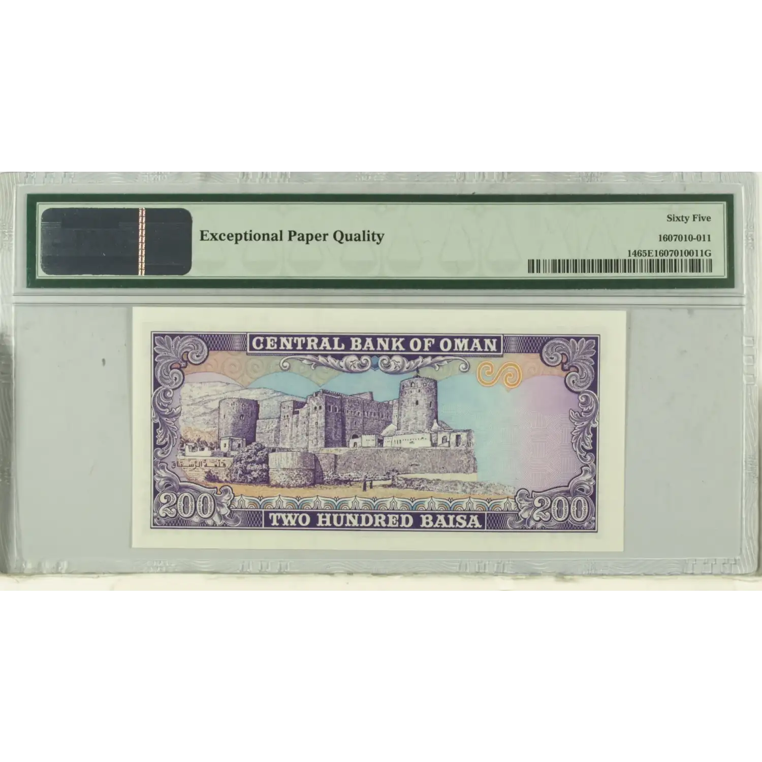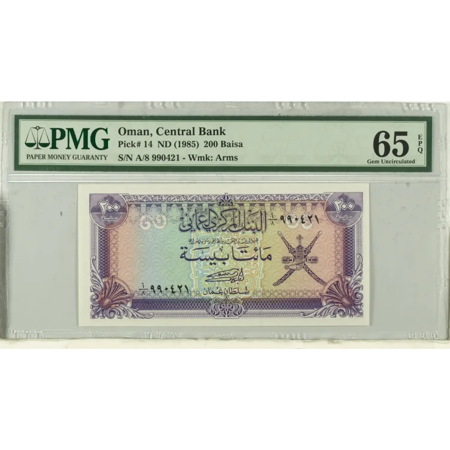 1985 Oman Central Bank 200 Baisa Pick#P-14 PMG CU 65 EPQ - Wmk: Arms