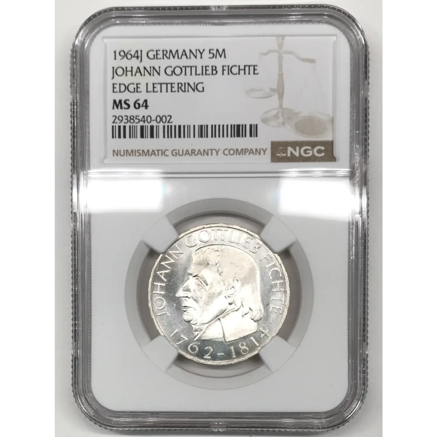 1964-J GERMANY-FEDERAL REPUBLIC Silver 5 MARK NGC MS-64 - JOHANN GOTTLIEB FICHTE, EDGE LETTERING - KM#118.1