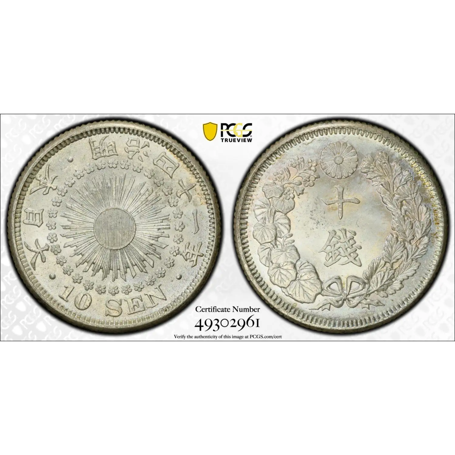 1908 (Meiji M41) JAPAN Silver 10 SEN PCGS MS-66 - JNDA 01-25, Y-29