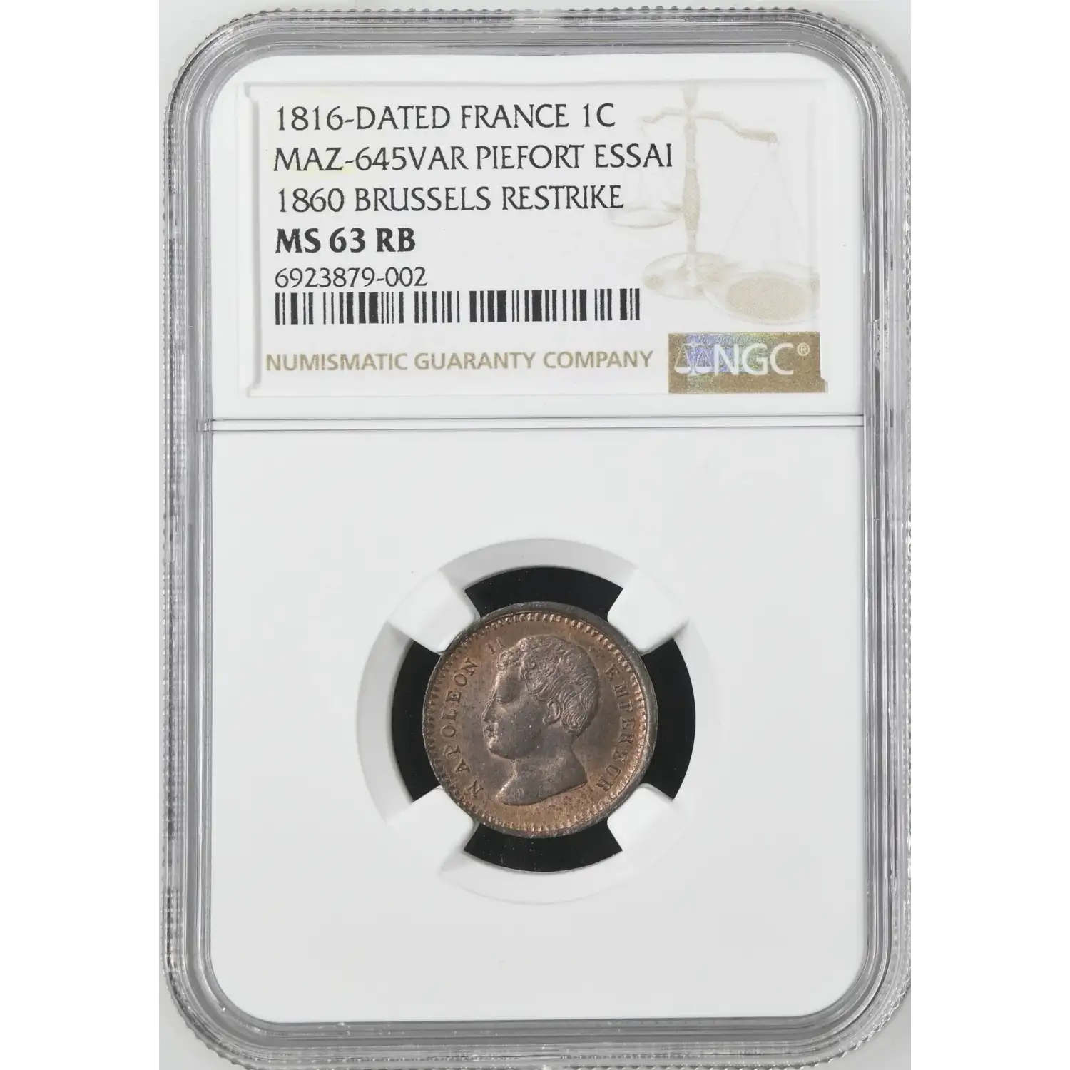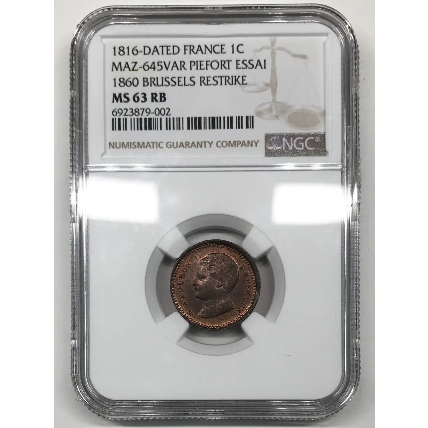 1816 France Bronze 1 Centime NGC MS-63 RB - MAZ-645VAR PIEFORT ESSAI 1860 BRUSSELS RESTRIKE