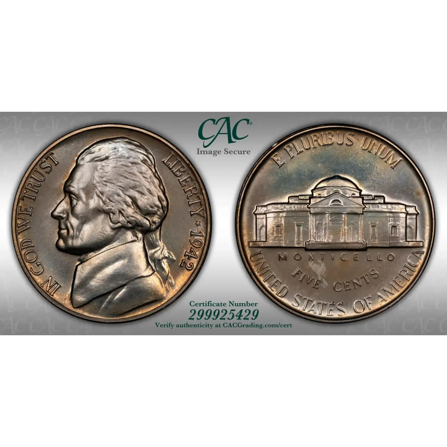 1942 Jefferson Nickel CACG PR 65 Type 1 CAC
