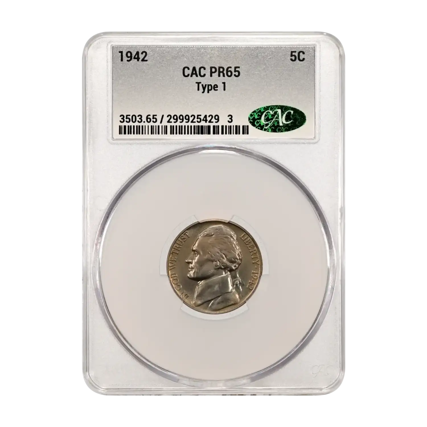 1942 P Type 1 Proof Jefferson Nickel CAC Grading (CACG) PR 65