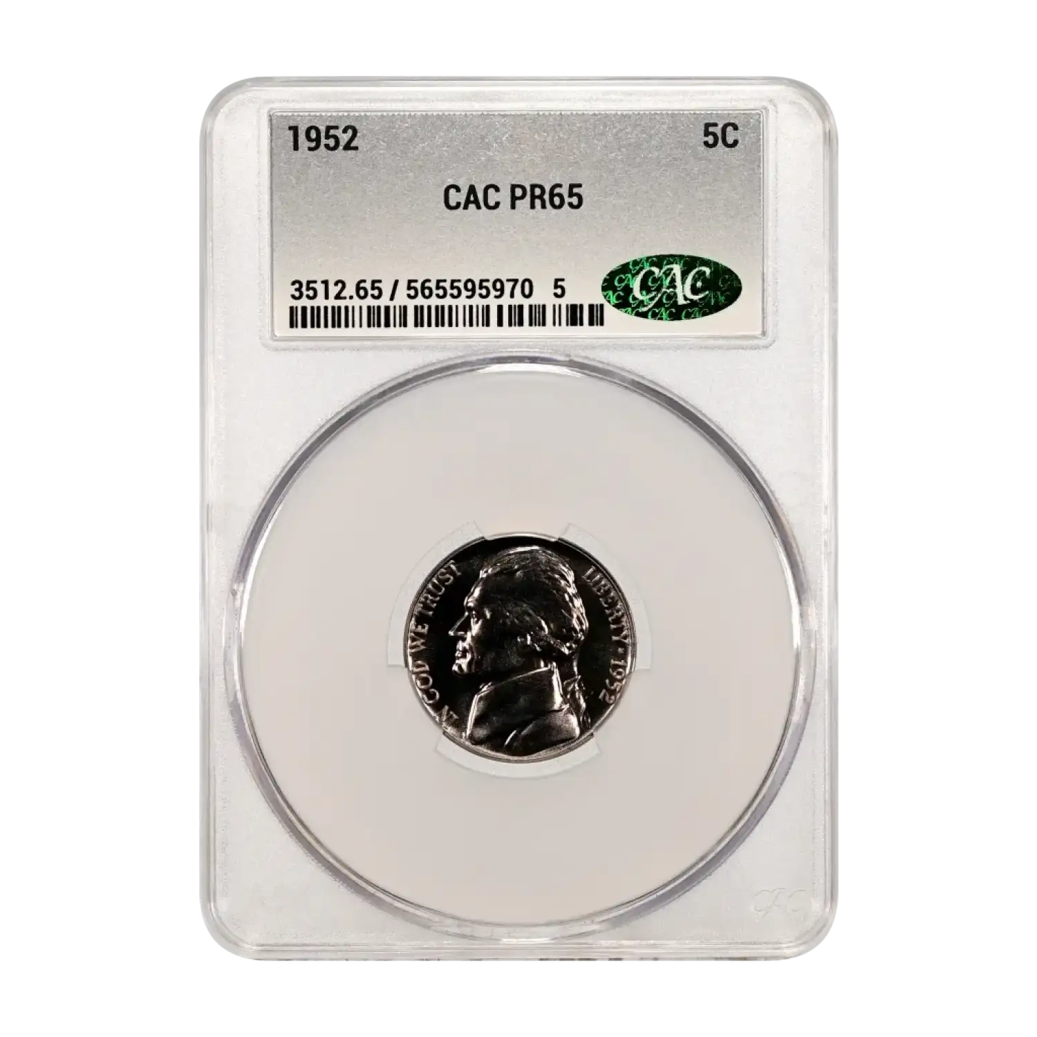 1952 Proof Jefferson Nickel CAC Grading (CACG) PR 65