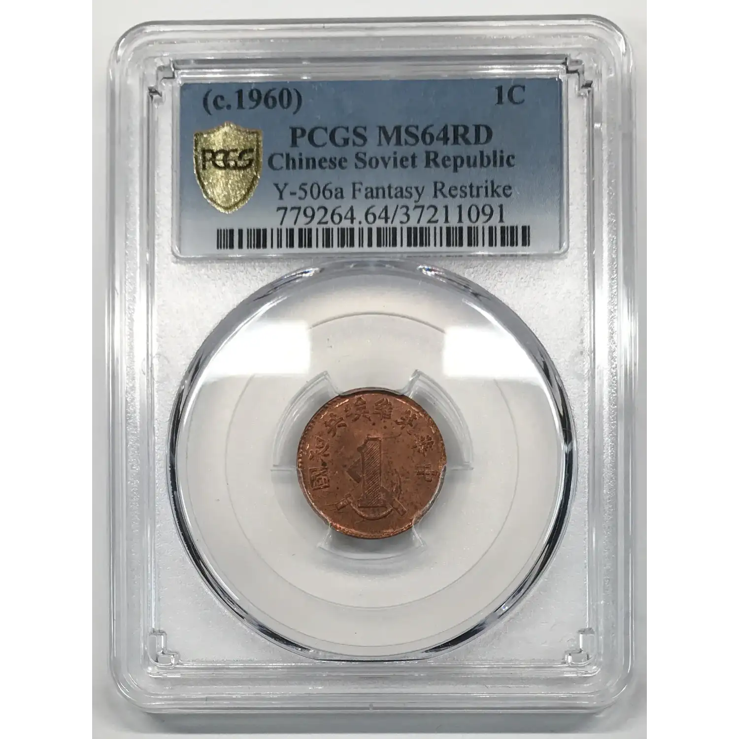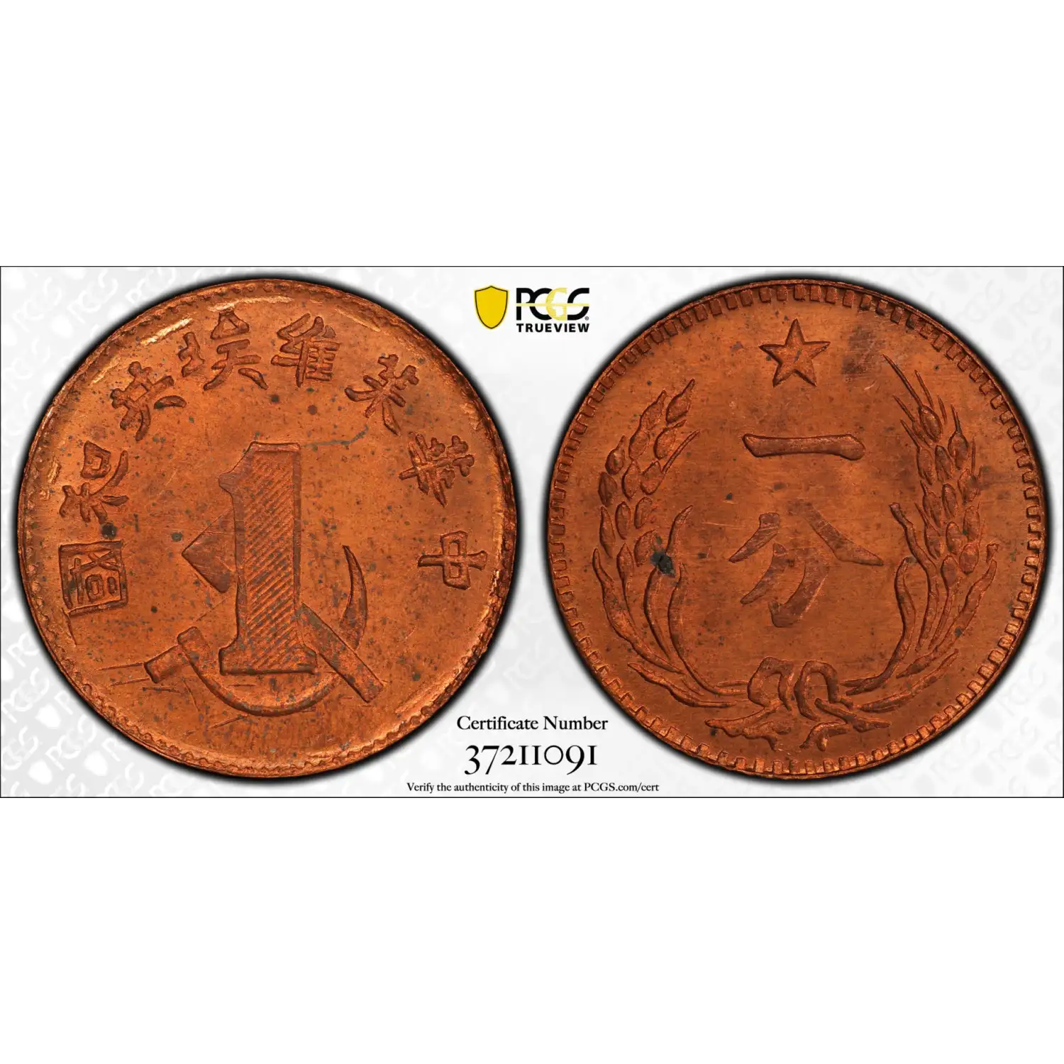 c. 1960 Chinese Soviet Republic Copper 1 Cent/Fen PCGS MS-64 RD - Y-506a Fantasy Restrike