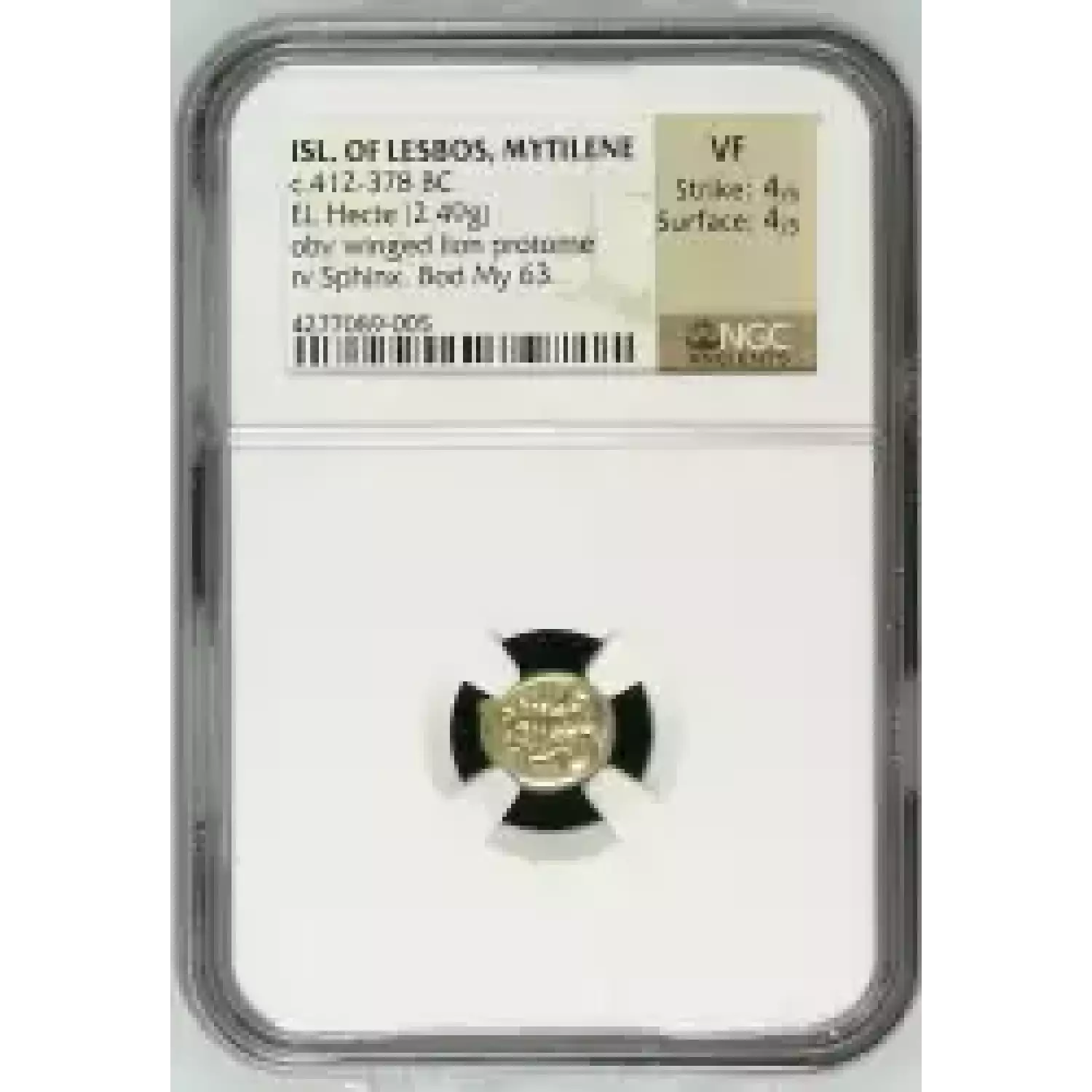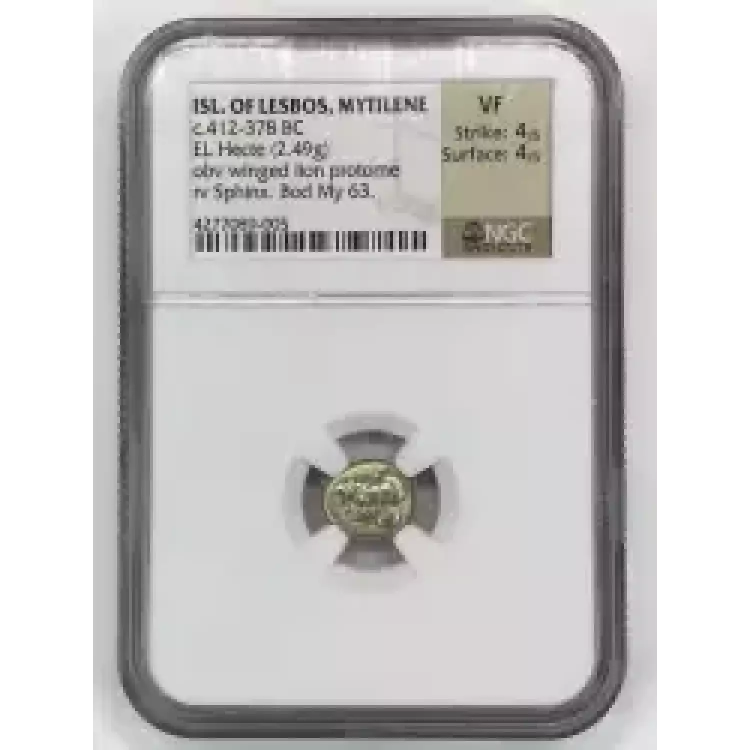 c.412-378 BC Isle of Lesbos, Mytilene, EL Hecte, obverse: winged lion protome, reverse: Sphinx. NGC Ancients VF 4 4