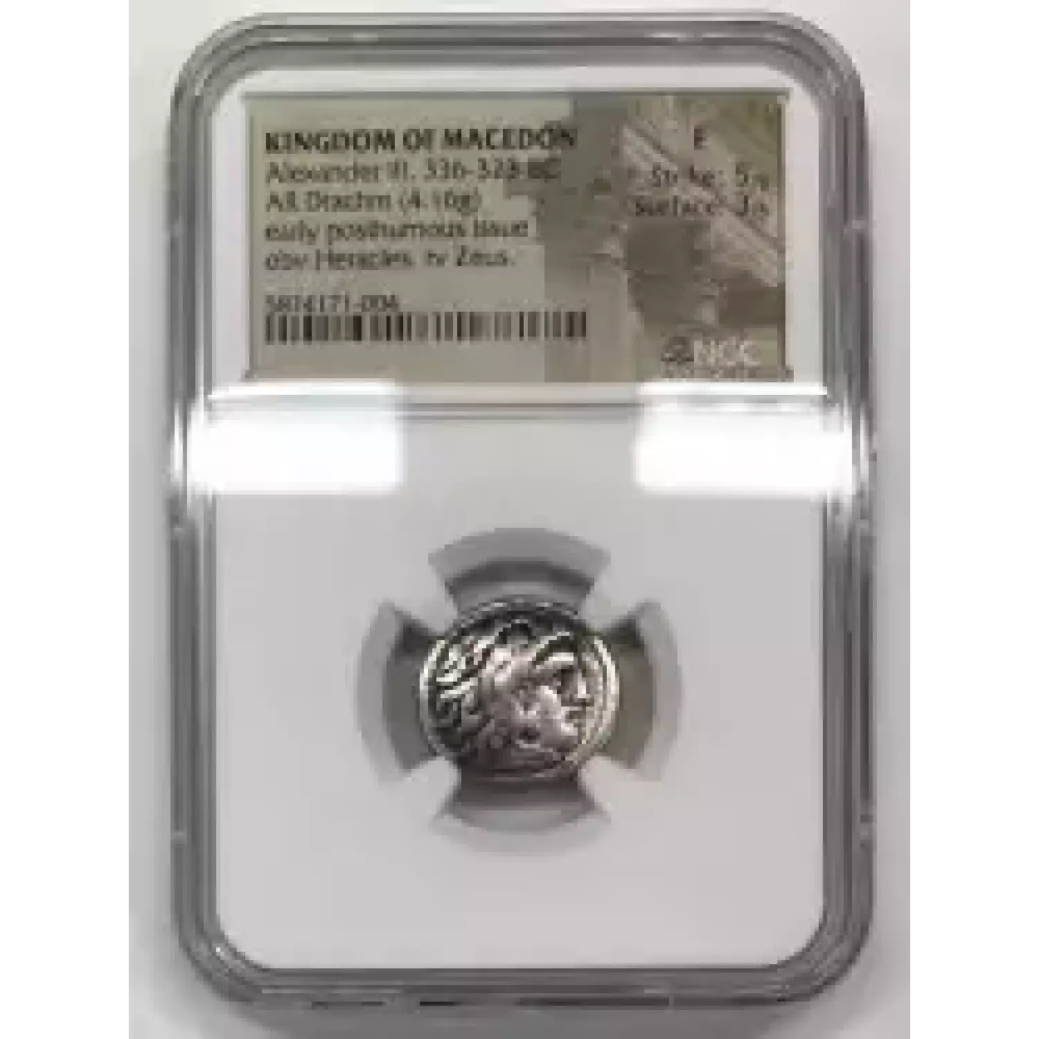 Kingdom of Macedon Alexander III, 336-323 BC, AR Drachm (4.16 grams); early posthumous issue; obverse: Heracles, reverse: Zeus; NGC Ancients F 5 3. Nice fresh slab, straight from NGC to our store.