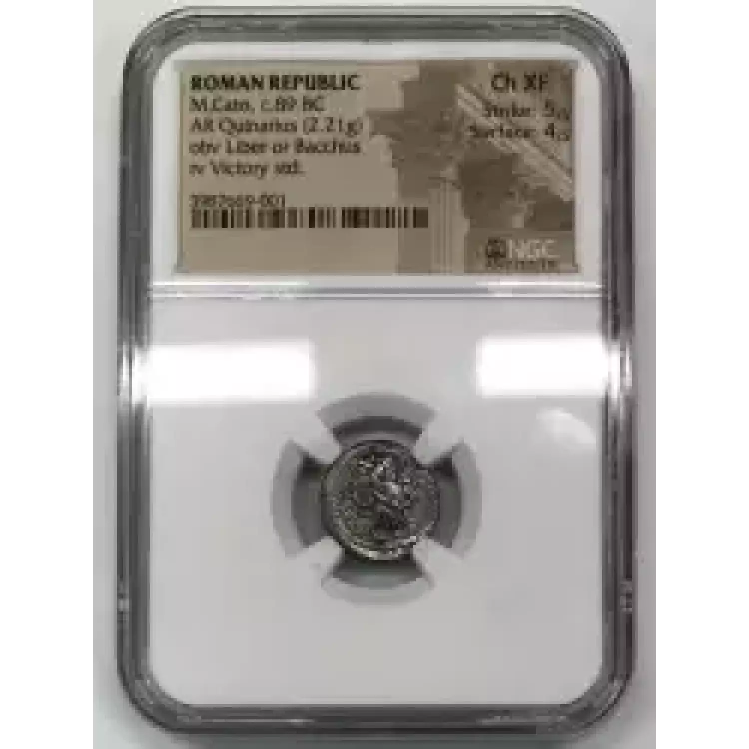 Roman Republic M. Cato c. 89 BC, AR Quinarius, obverse: Liber or Baccus, reverse: Victory seated, NGC Ancients Ch XF 5 4