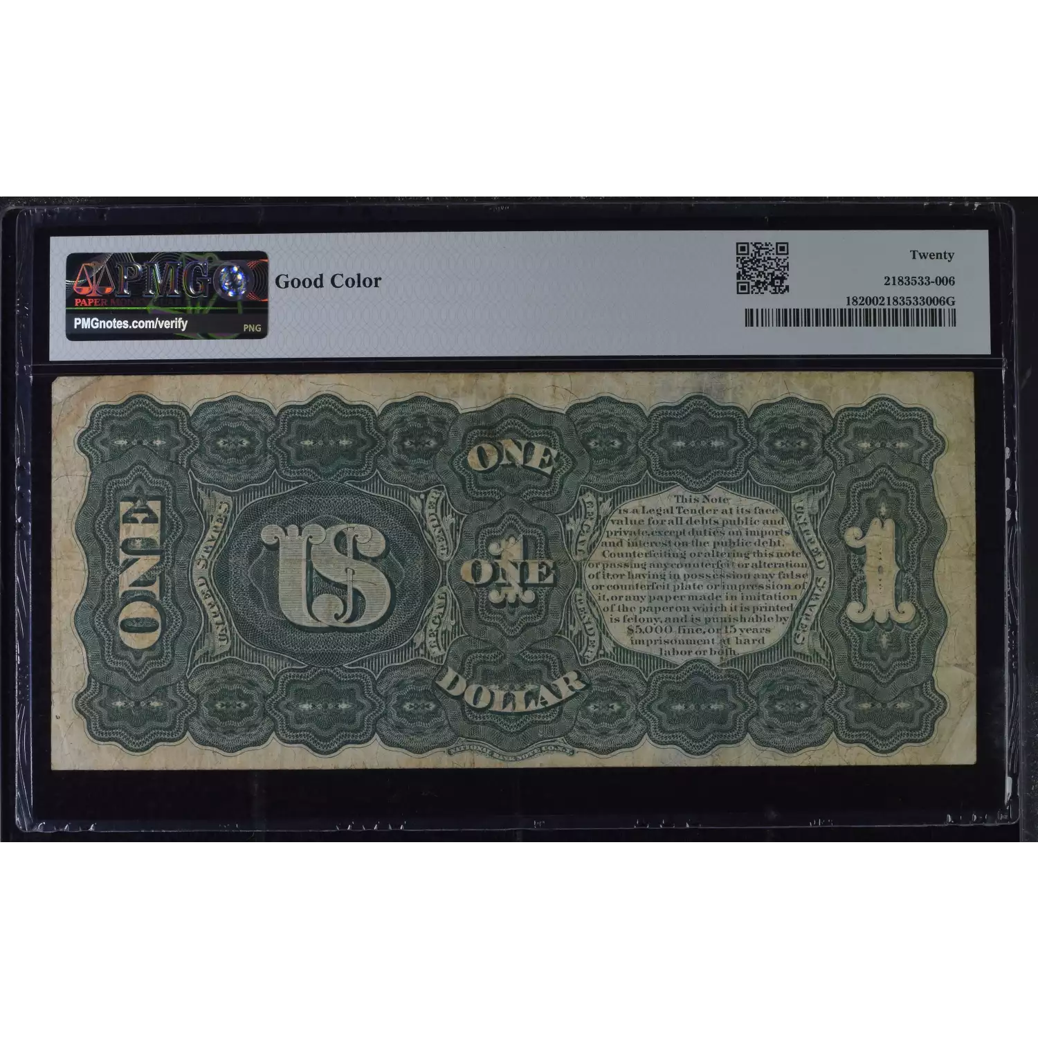 1869 $1 Legal Tender Rainbow Note FR 18 PMG VF 20 - Good Color