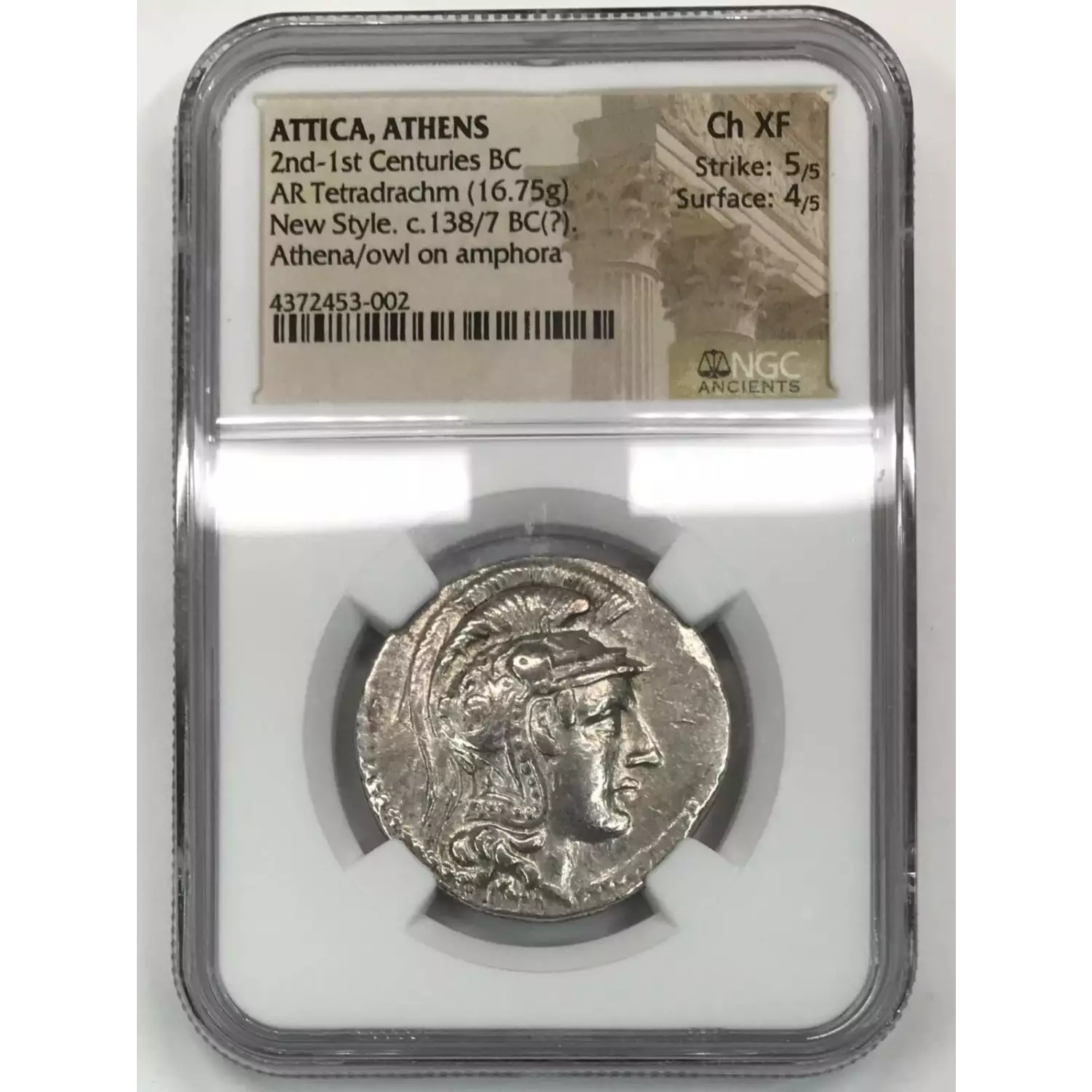 Attica, Athens, 2nd-1st Centuries BC, AR Tetradrachm, New Style c. 138/7 BC, obverse: Athena, reverse: owl on amphora - NGC Ancients Choice XF 5 4