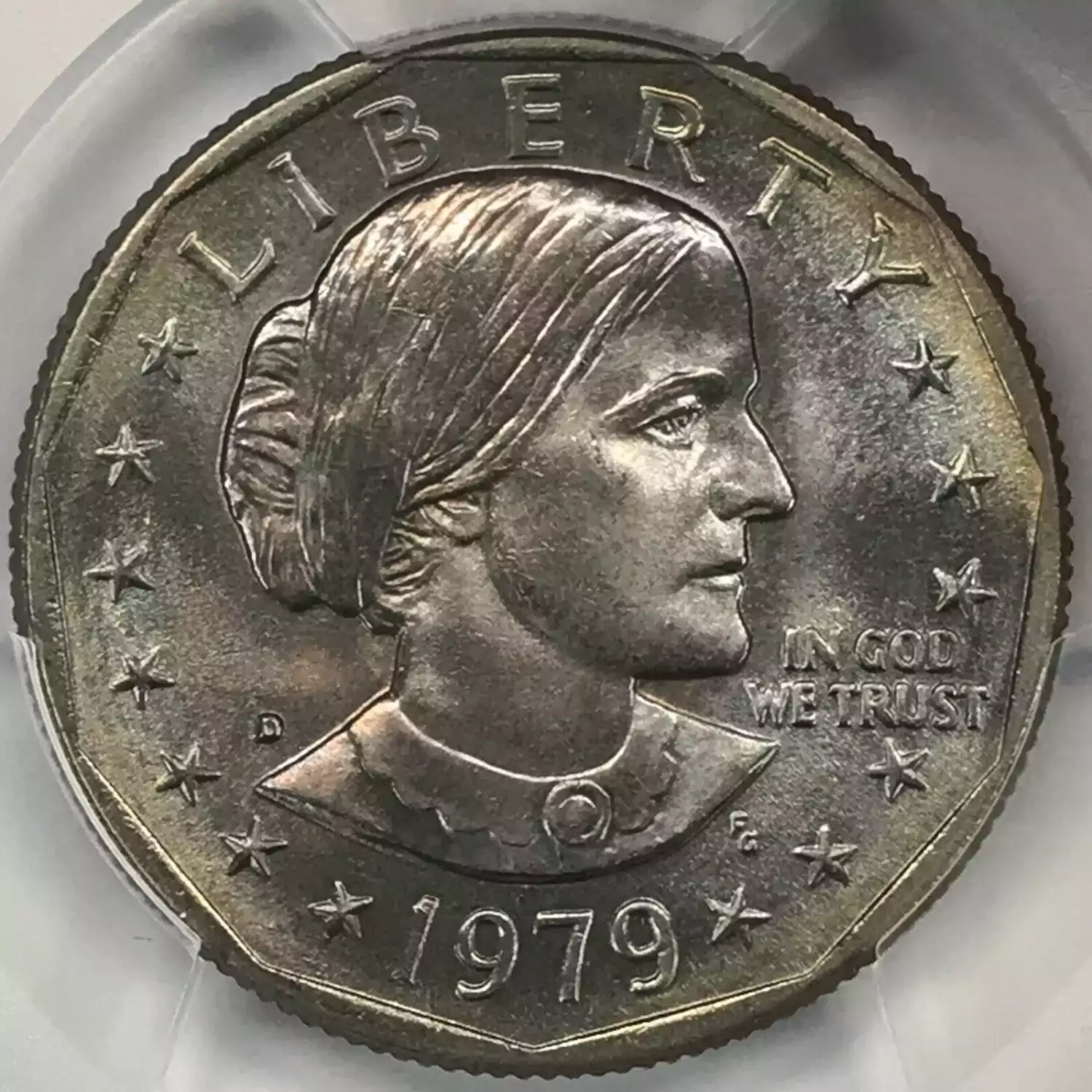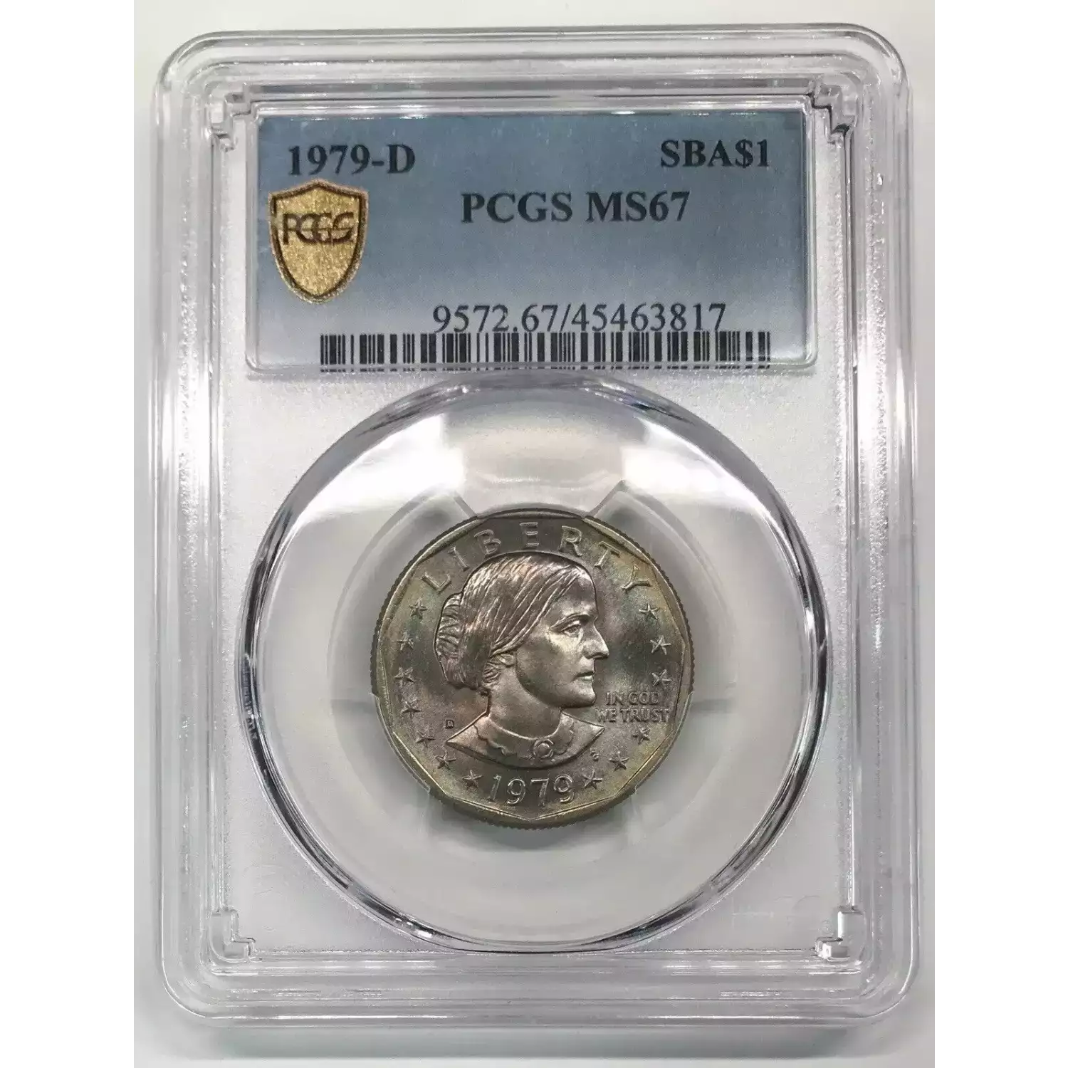 1979-D Susan B Anthony (SBA) Dollar PCGS MS67 - *Rainbow Toning* - Pop 138/1 ; attractive rainbow toning on both sides ; only one graded finer by PCGS ; nice coin, high grade, attractive toning...hard to find a better 1979-D SBA ; great registry coin
