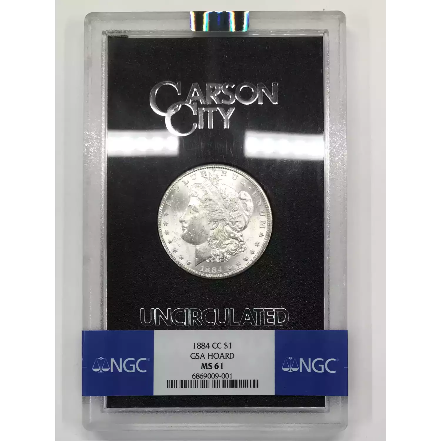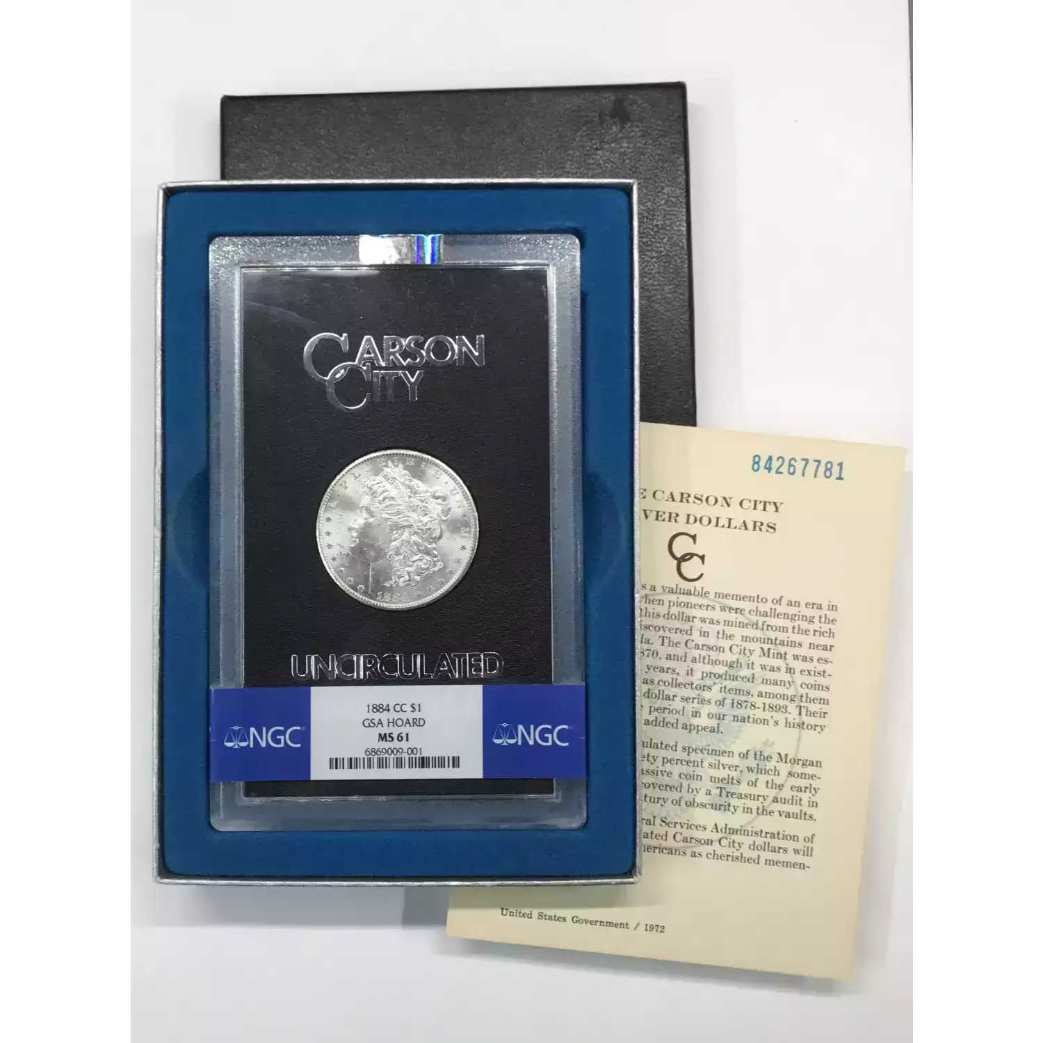 1884-CC GSA HOARD Morgan Silver Dollar NGC MS-61 - w Box & COA - box lid is fully separated from bottom