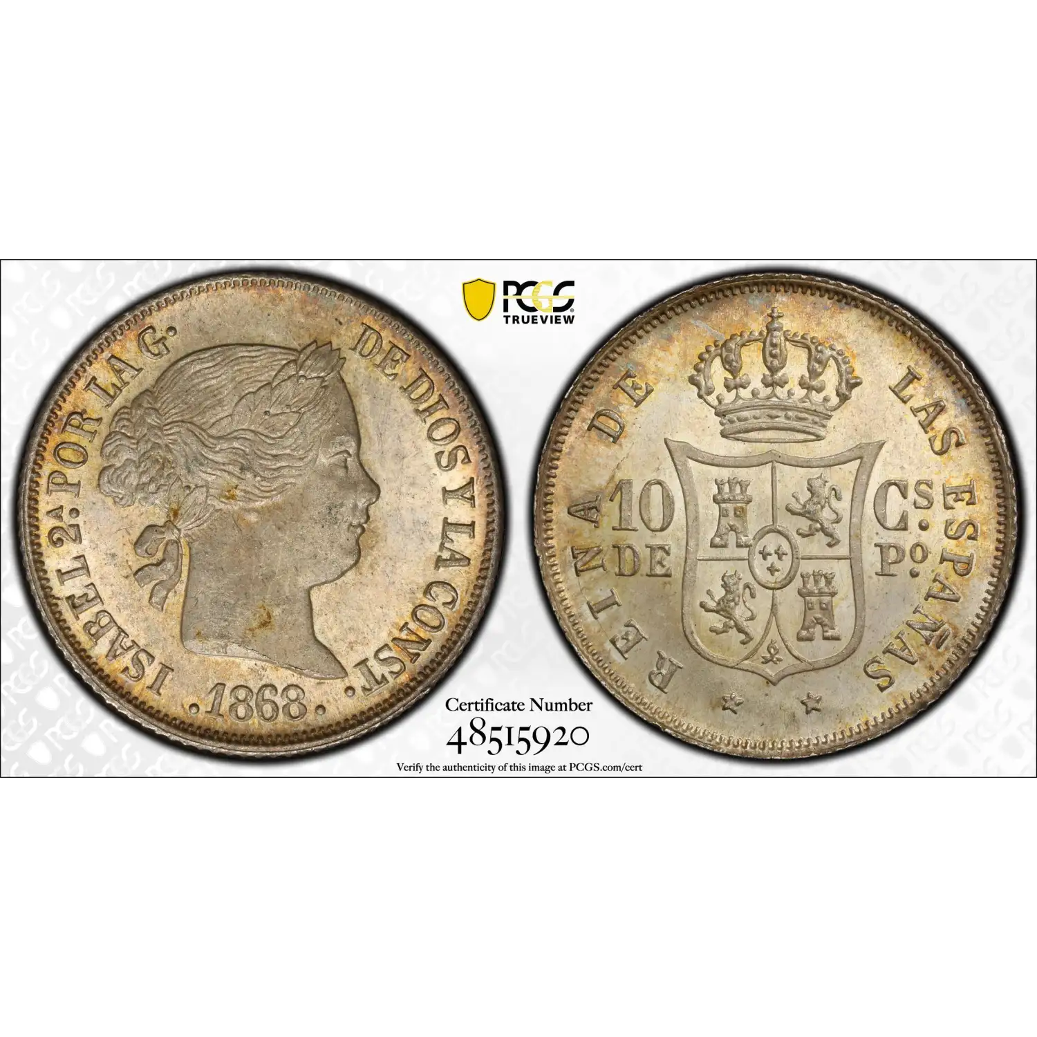 1868 PHILIPPINES Silver 10 CENTIMOS PCGS MS-65