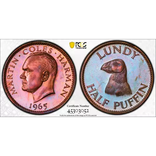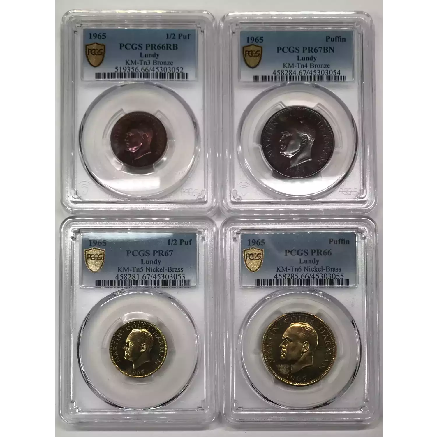 1965 Lundy Bronze & Nickel-Brass Puffin & Half Puffin 4 Proof Coin Set - PCGS PR66/67 Includes: - 1965 Lundy Proof Bronze Half Puffin (KM#Tn3) PCGS PR66RB - 1965 Lundy Proof Bronze Puffin (KM#Tn4) PCGS PR67BN - 1965 Lundy Proof Nickel-Brass Half Puffin (KM#Tn5) PCGS PR67 - 1965 Lundy Proof Nickel-Brass Puffin (KM#Tn6) PCGS PR66