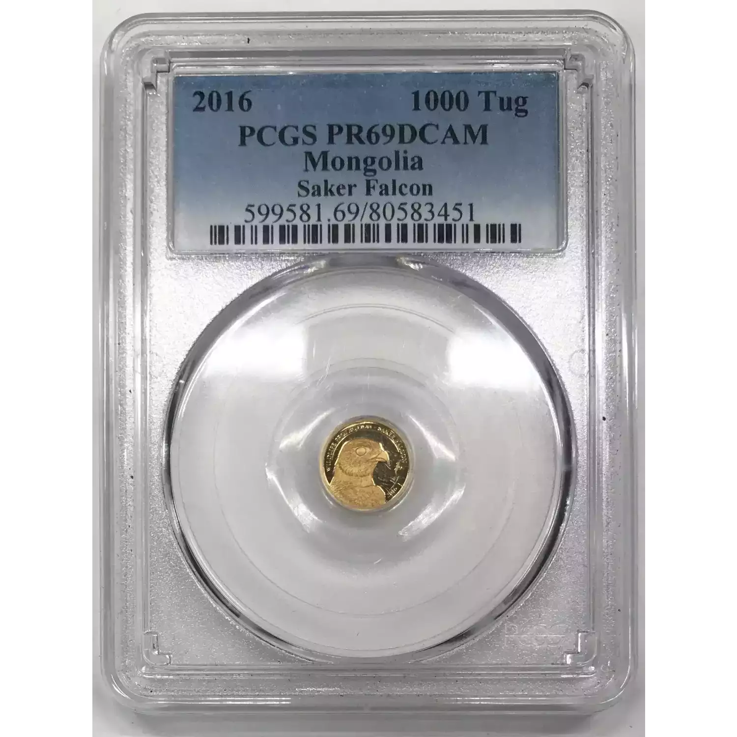 2016 Saker Falcon MONGOLIA Gold 1000 TUGRIK PCGS PR-69 DCAM - 0.5 grams .9999 fine