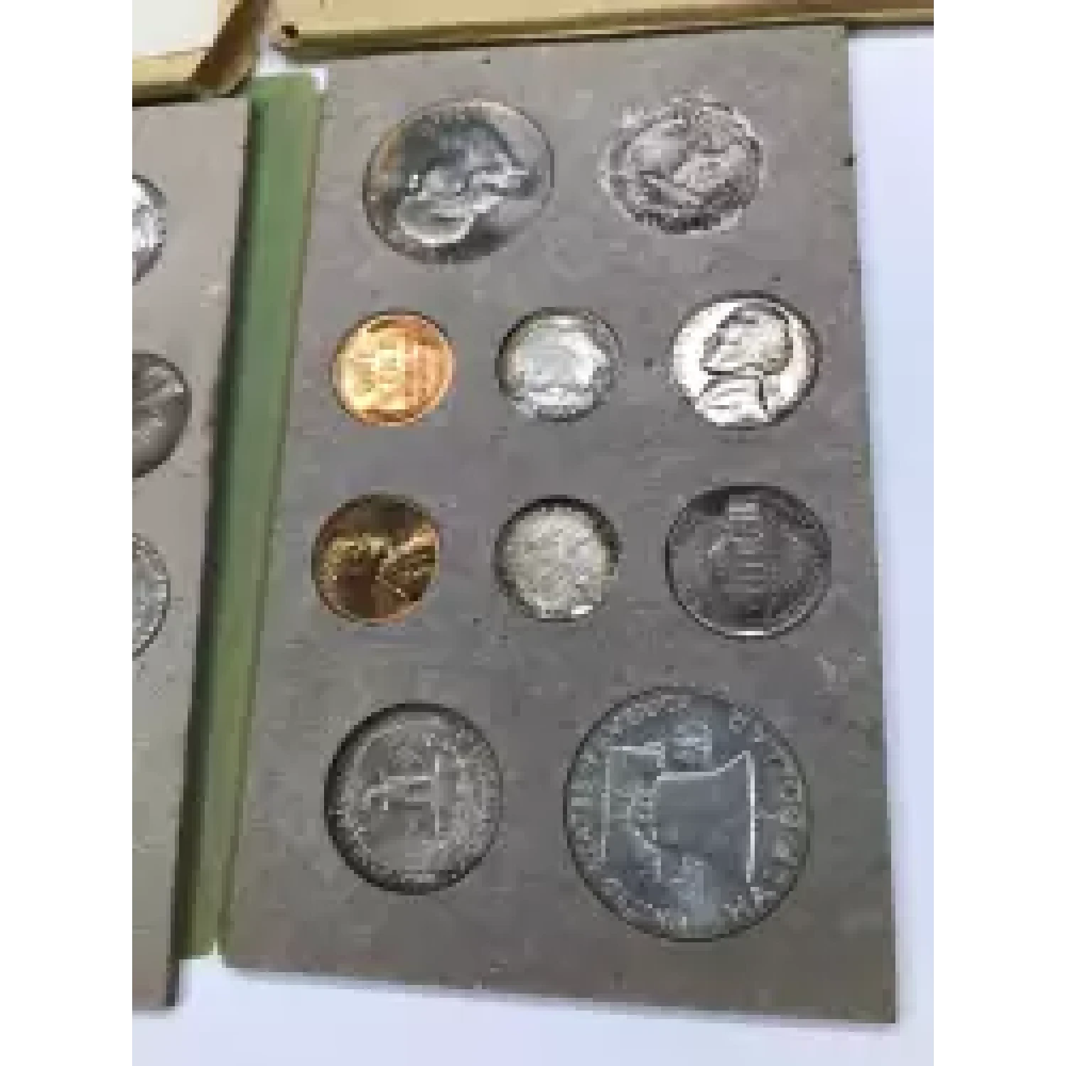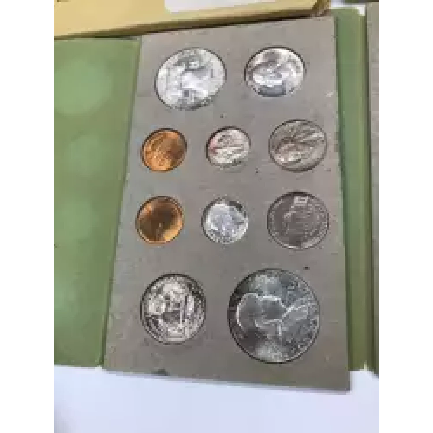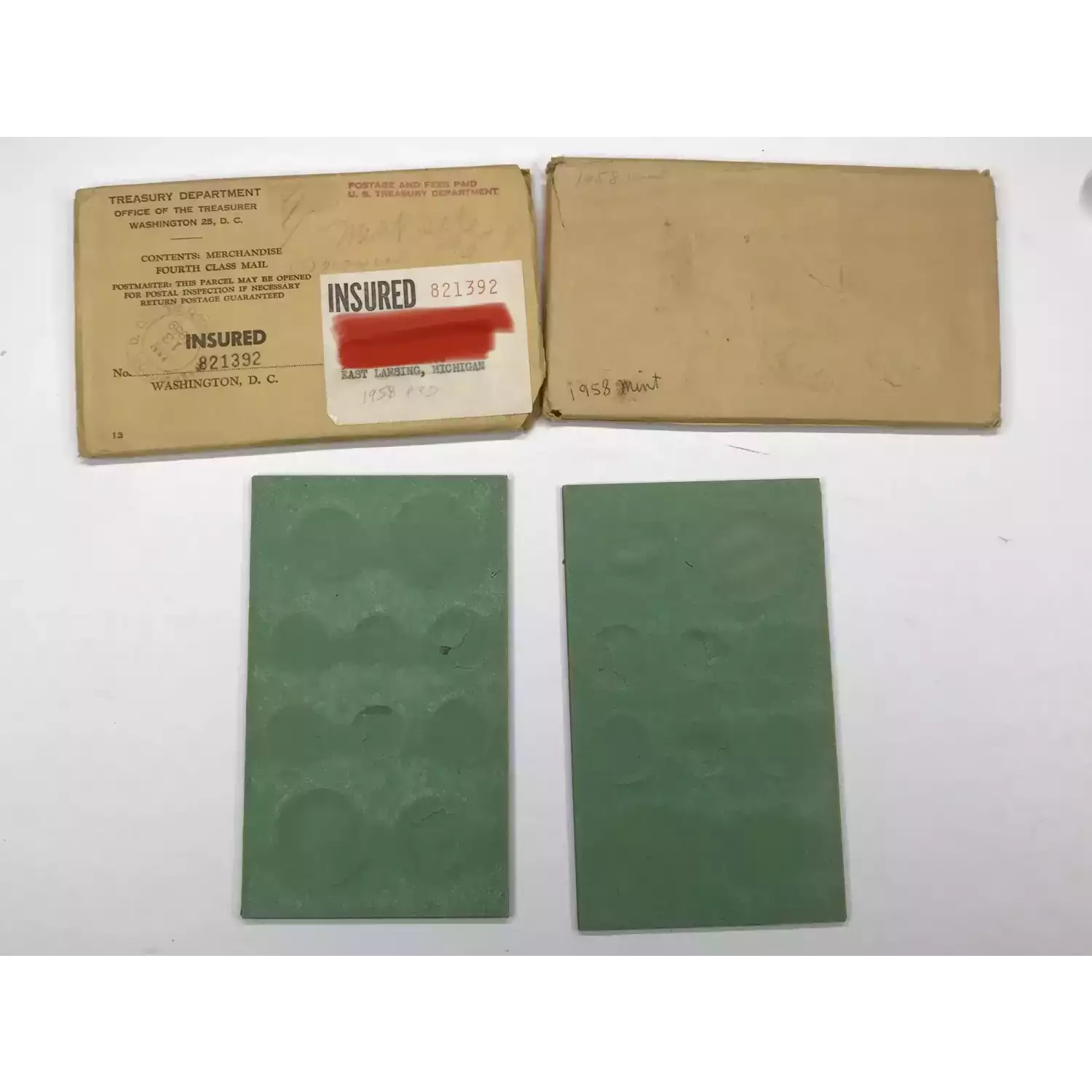 Complete 1958 P D US Mint Uncirculated 20-Coin Set - nice original toning - includes envelope & mailing envelope - note that back of boards have some tears, some coins may have been punched out at some point - some tissue around rim of some coins to keep them in place in cardboard holder