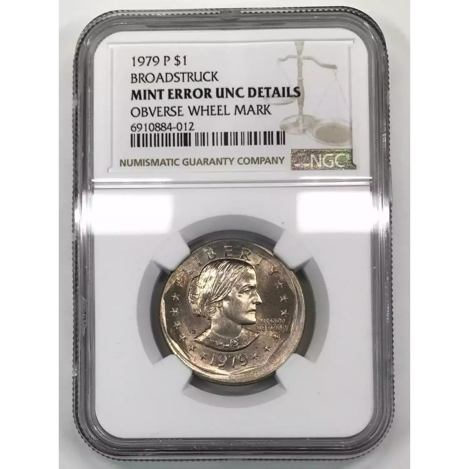 1979-P Susan B Anthony SBA Dollar *Broadstruck Mint Error* NGC UNC Details (obverse wheel mark) - nice error coin despite details grade - wheel mark is hard to find and only visible at certain angles - see coin in this video: https://youtu.be/pLl3bmLA5eo