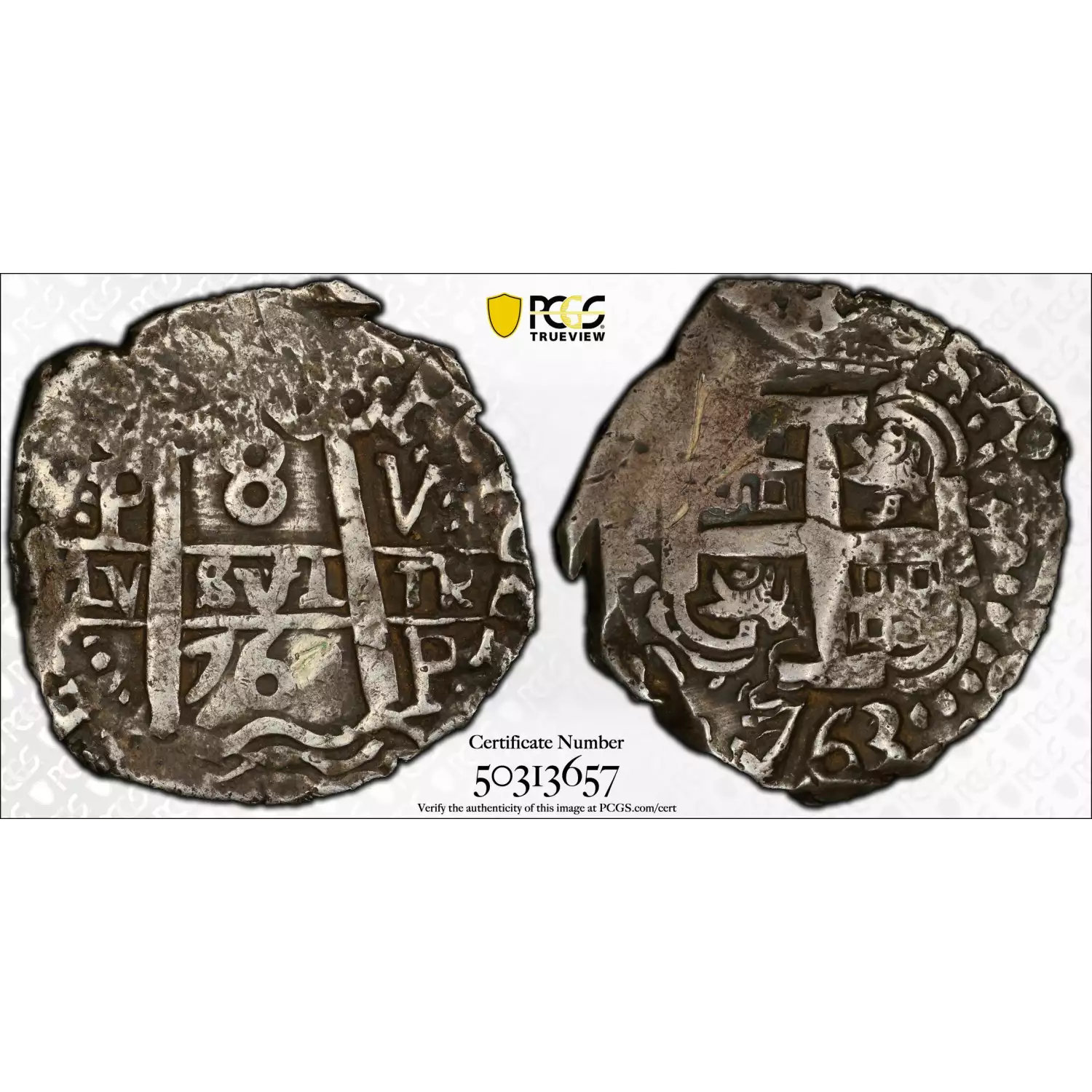 1763-P V-Y BOLIVIA Silver 8 REALES PCGS Genuine - VF Details (95 - Scratch) Calico-1139 - S. P. Rutherford Collection - 26.78 grams - thicker holder, some scratches - *mislabled* - coin is 1763, but label says 1762