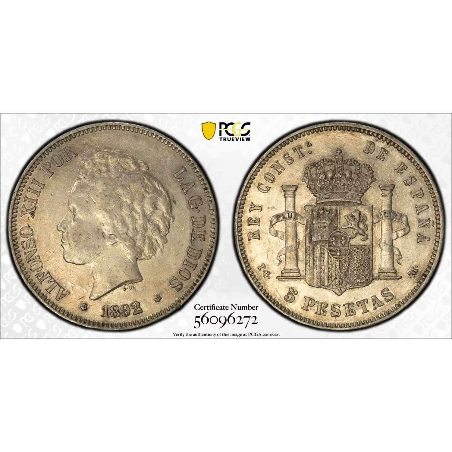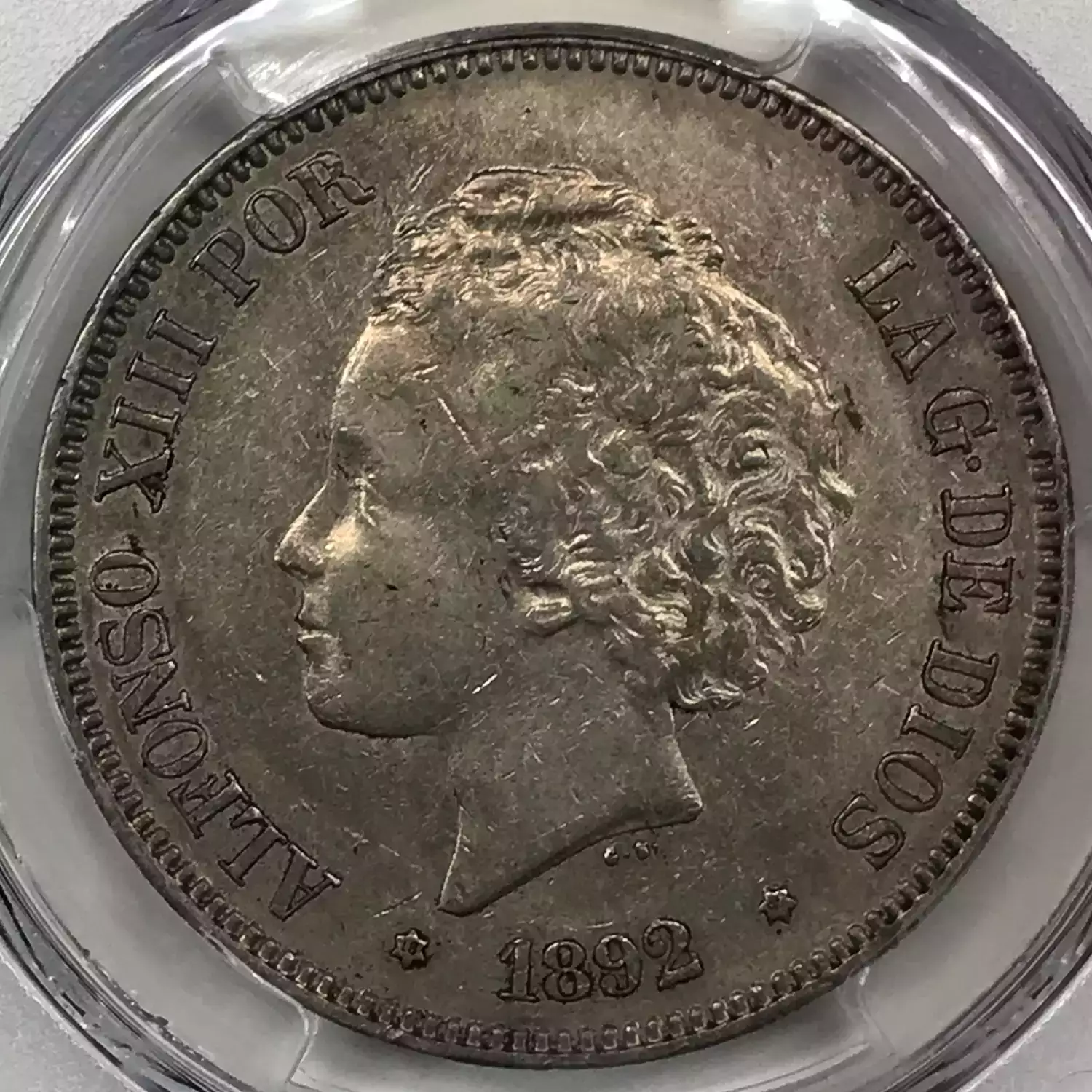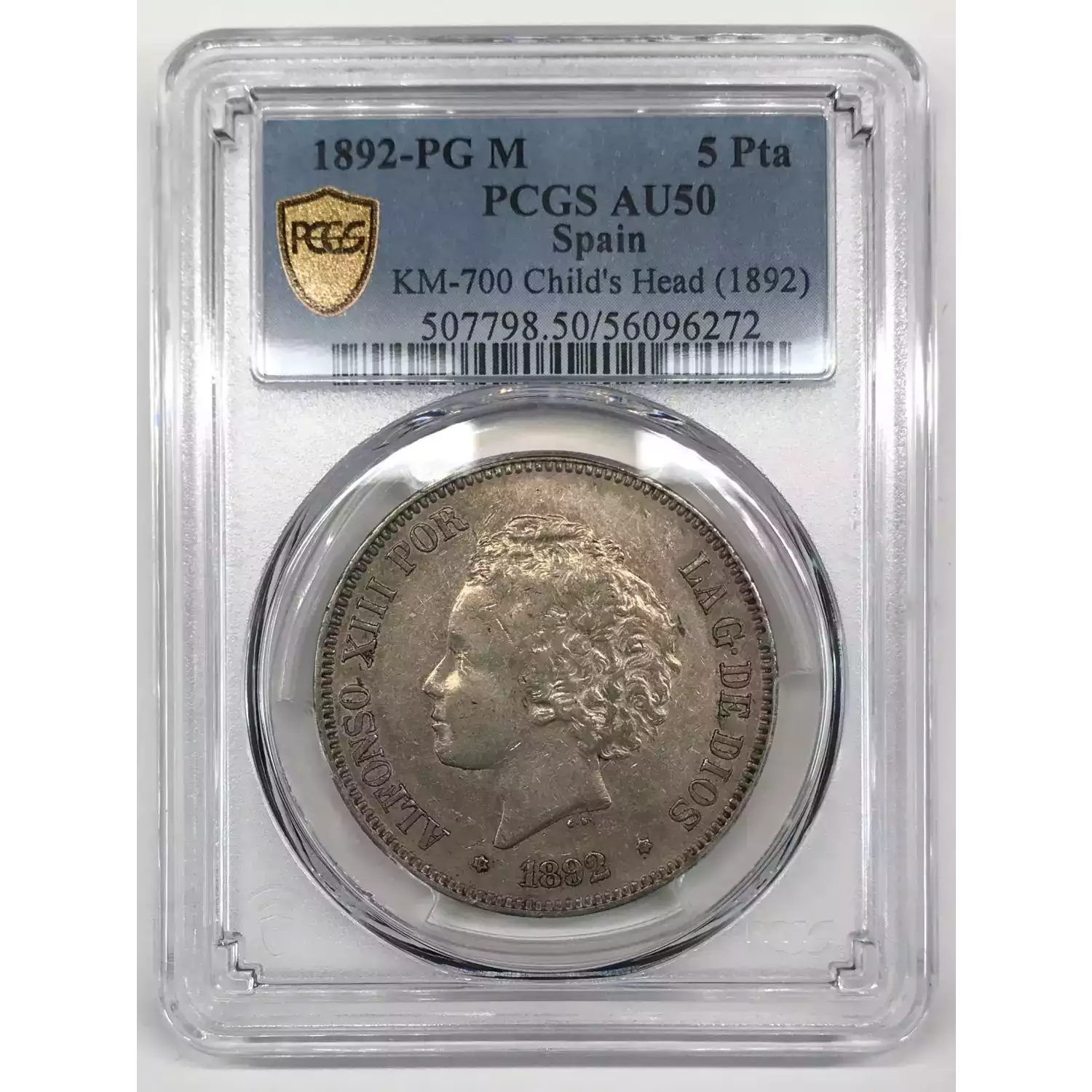 1892-PG M Spain Silver 5 PESETAS PCGS AU-50 KM-700 Child's Head (1892)