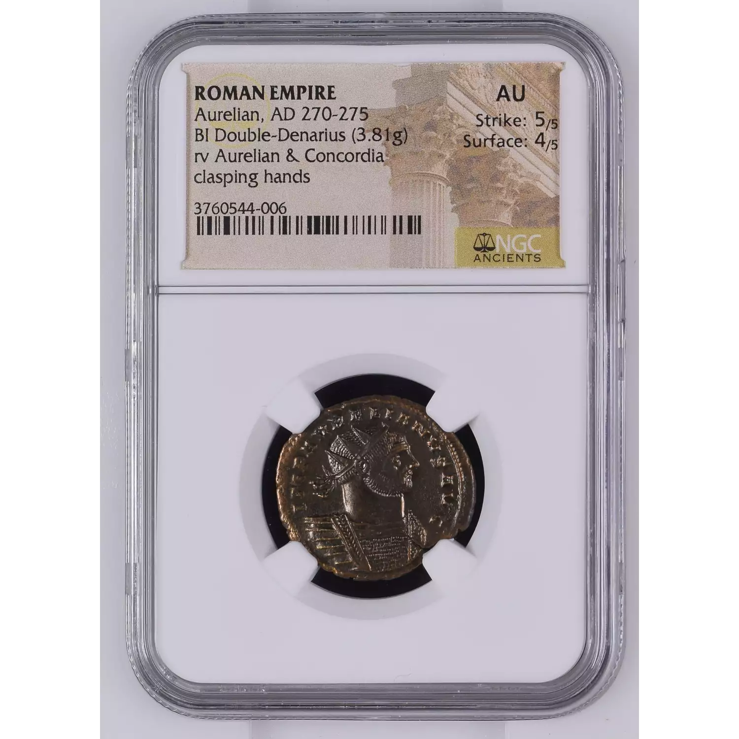 Roman Empire Aurelian, AD 270-275, BI Double-Denarius, reverse: Aurelian & Concordia clasping hands, NGC Ancients AU 5 4