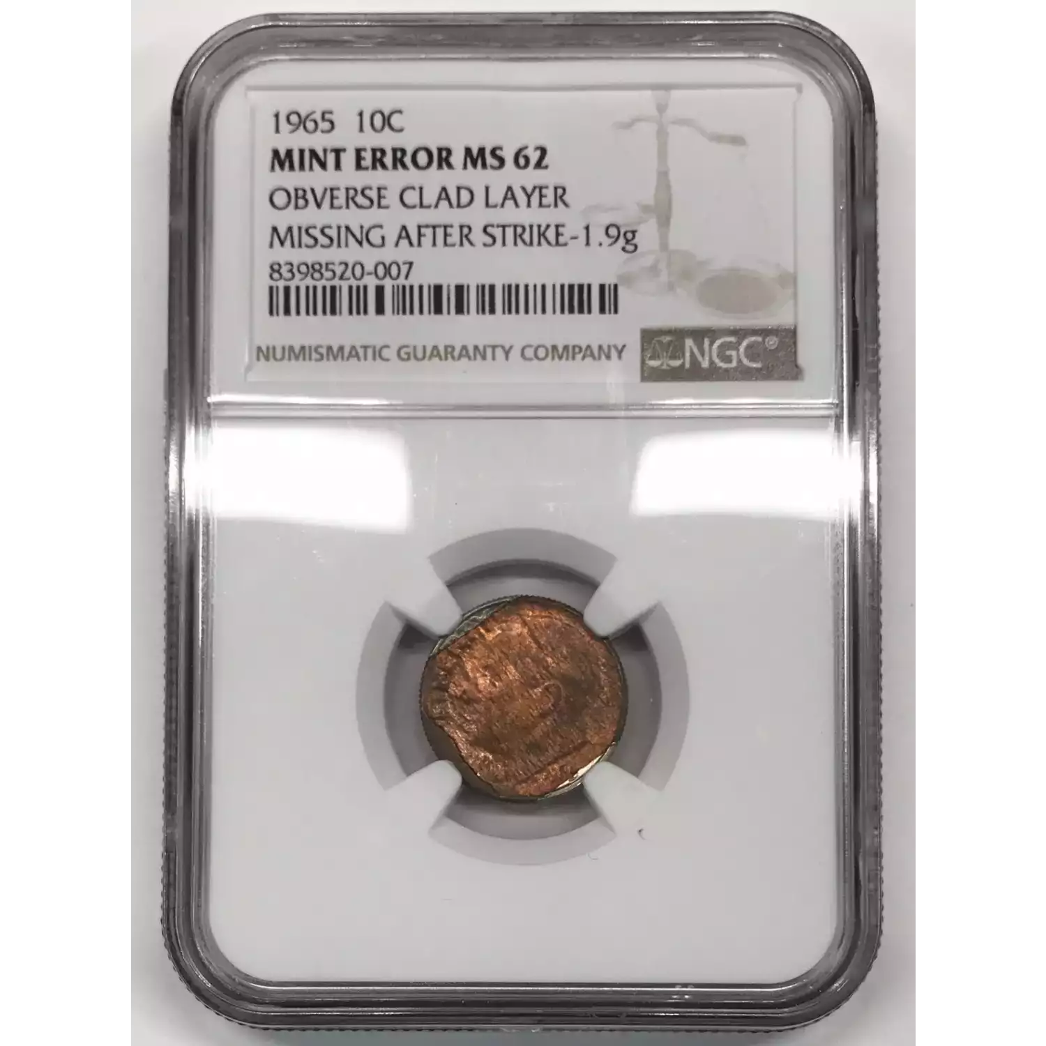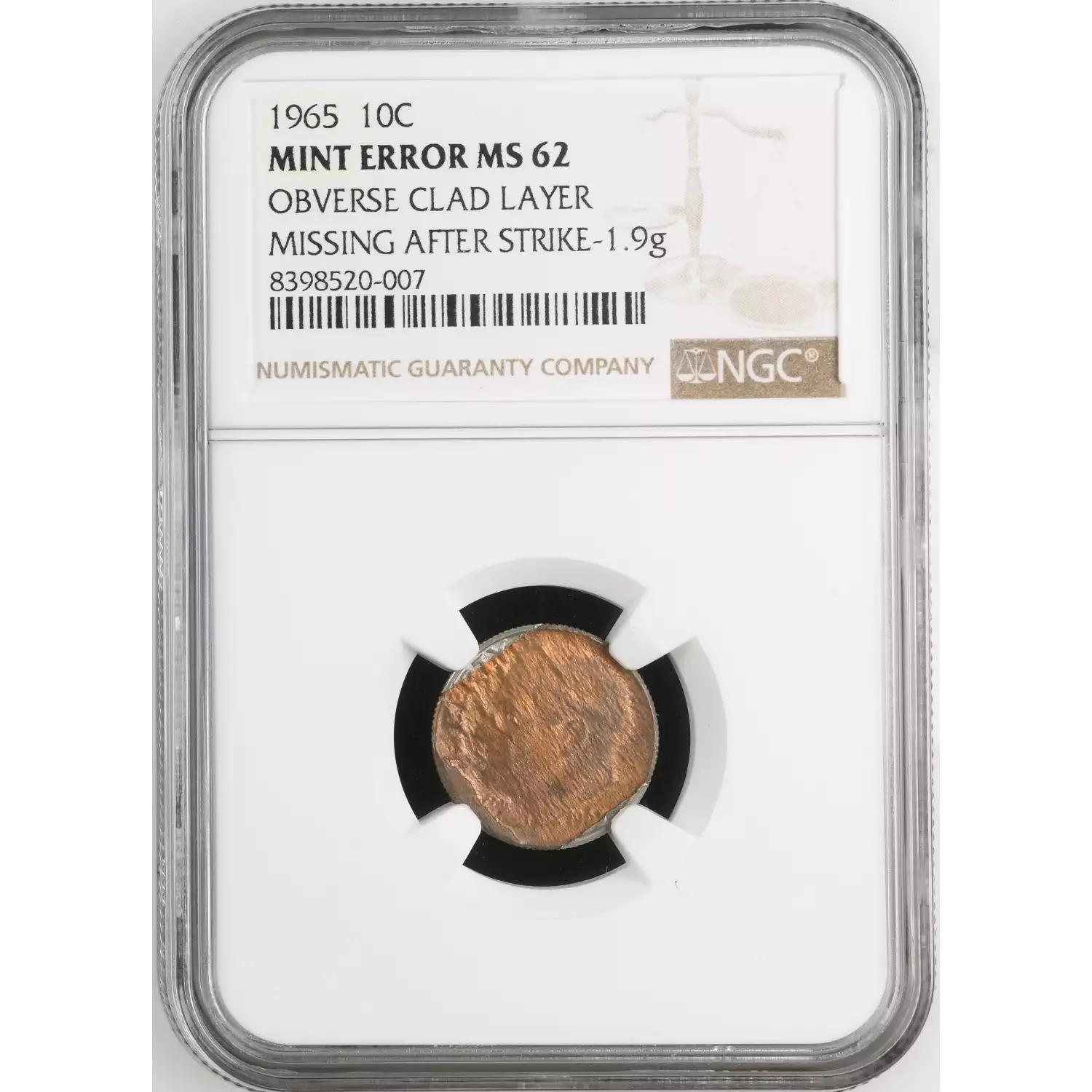 1965 Roosevelt Dime NGC MS-62 OBVERSE CLAD LAYER MISSING AFTER STRIKE
