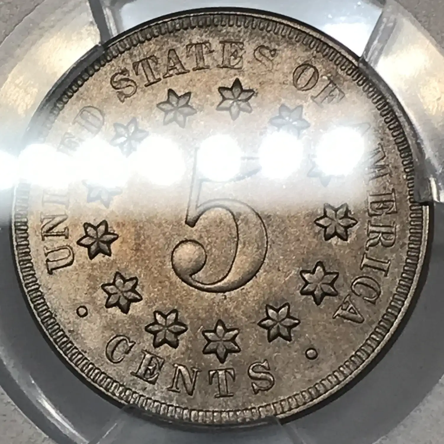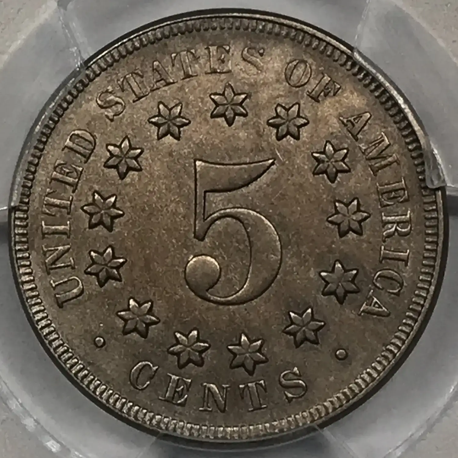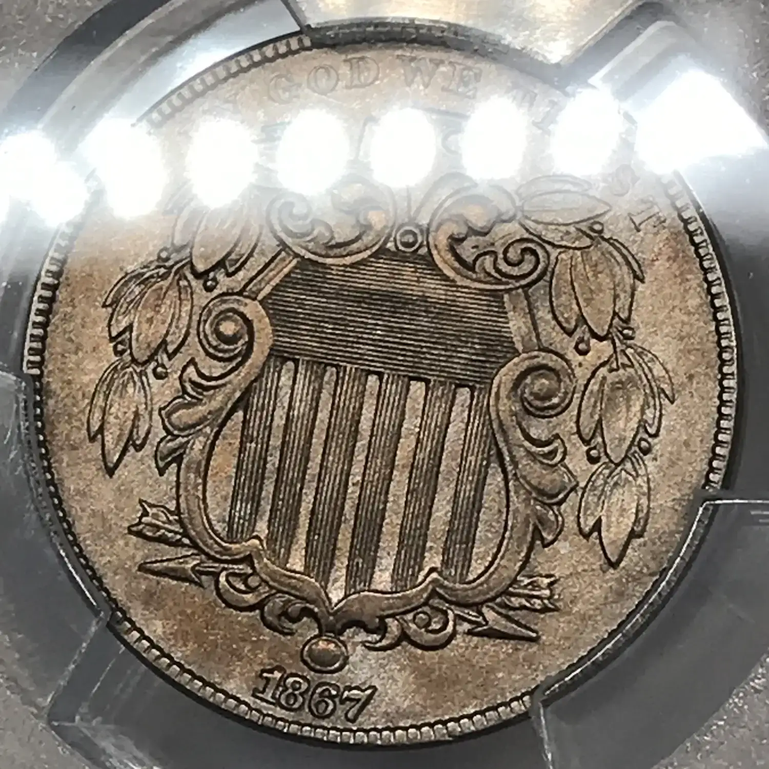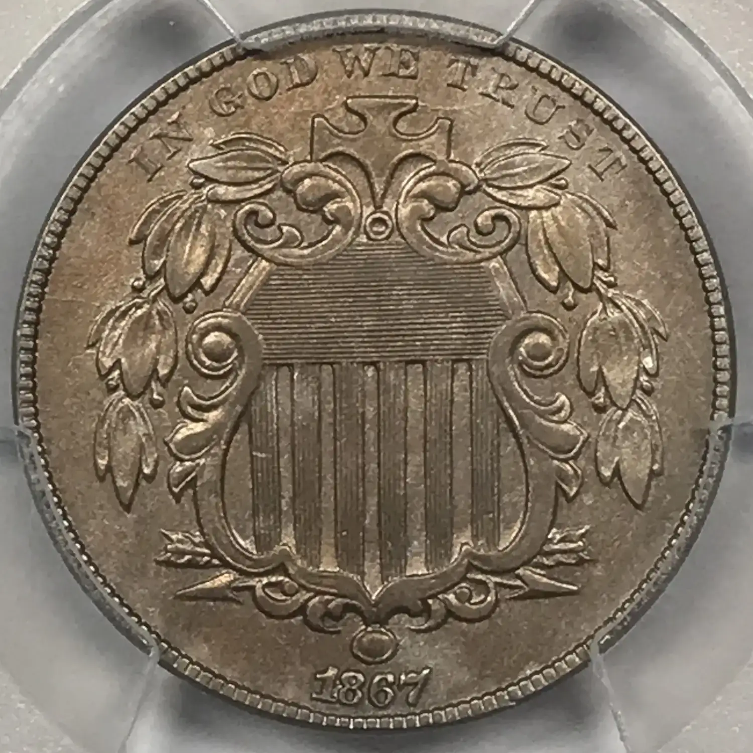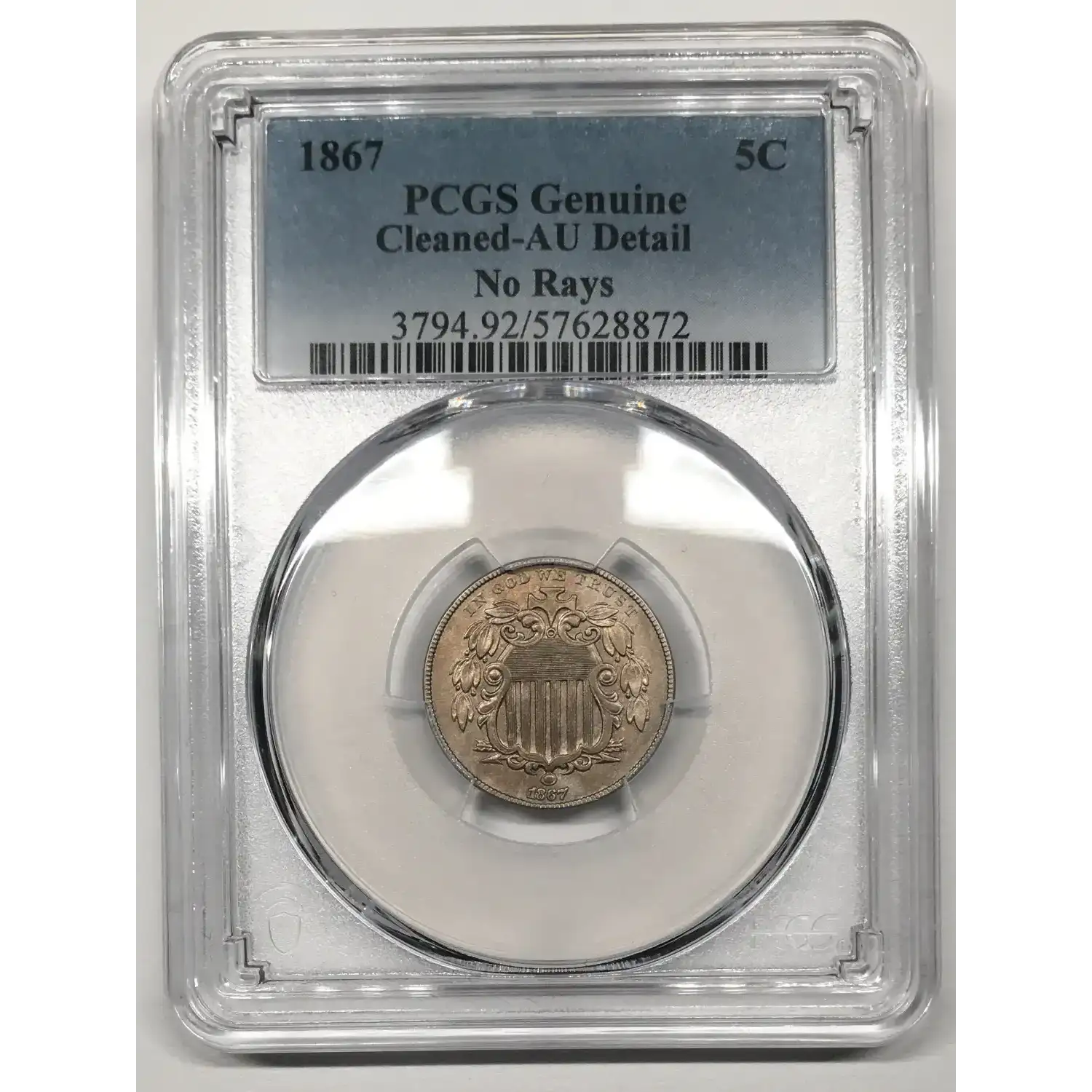 1867 P No Rays Shield Nickel PCGS Genuine AU Details (cleaned)