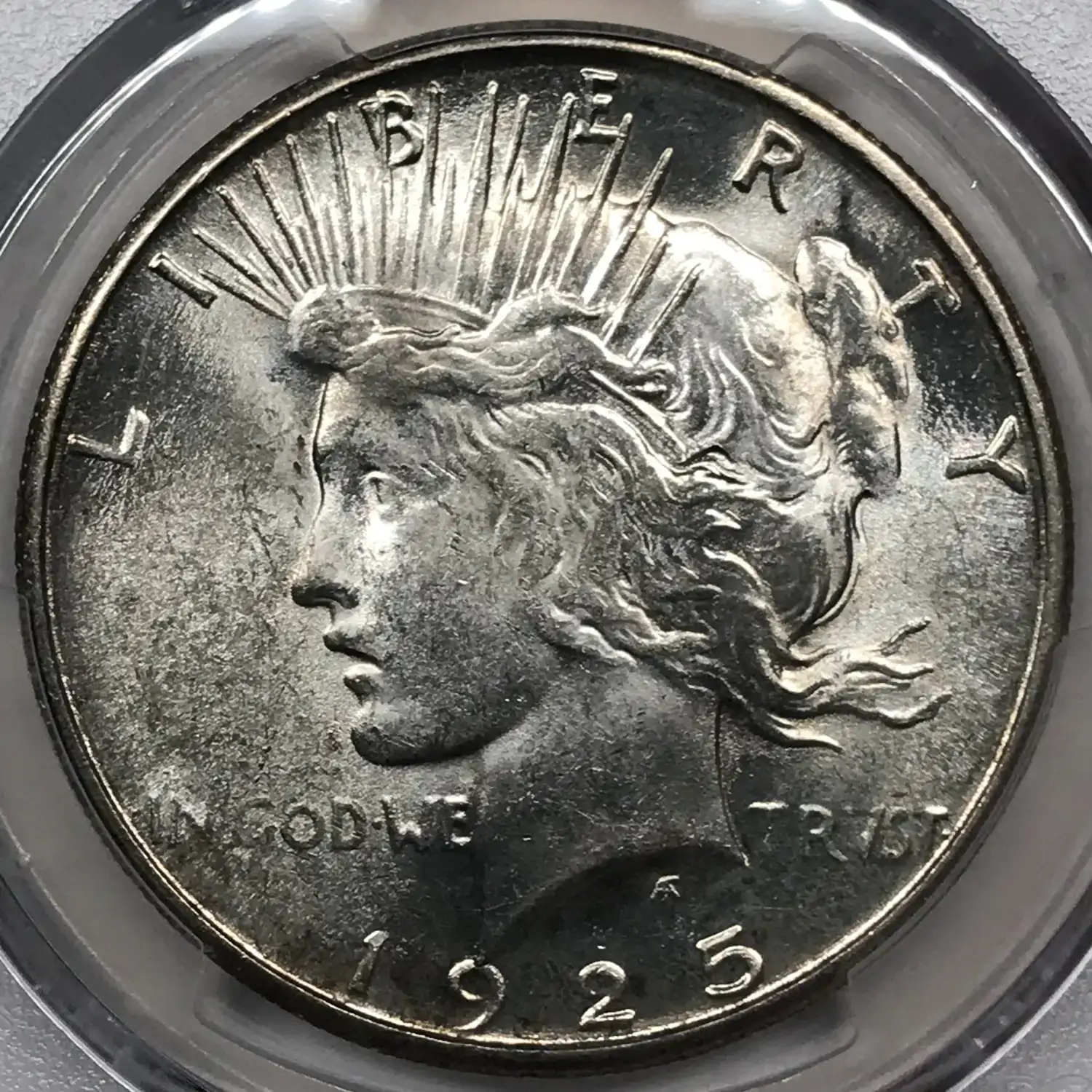 1925-S Peace Silver Dollar PCGS MS-62 - TOP 50 VAM-2 DDR Doubled Die Reverse Leaves Olive Branches - has die marker of die chip near tiara rays left of B of LIBERTY - note that variety is not attributed on label