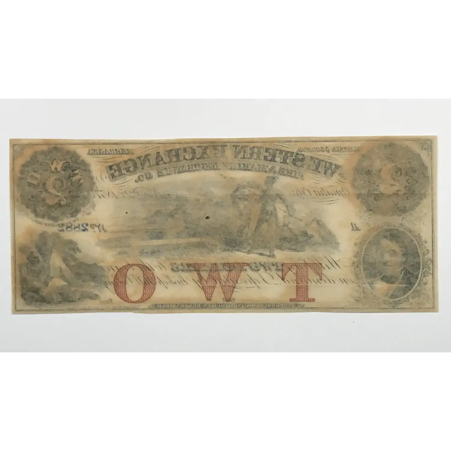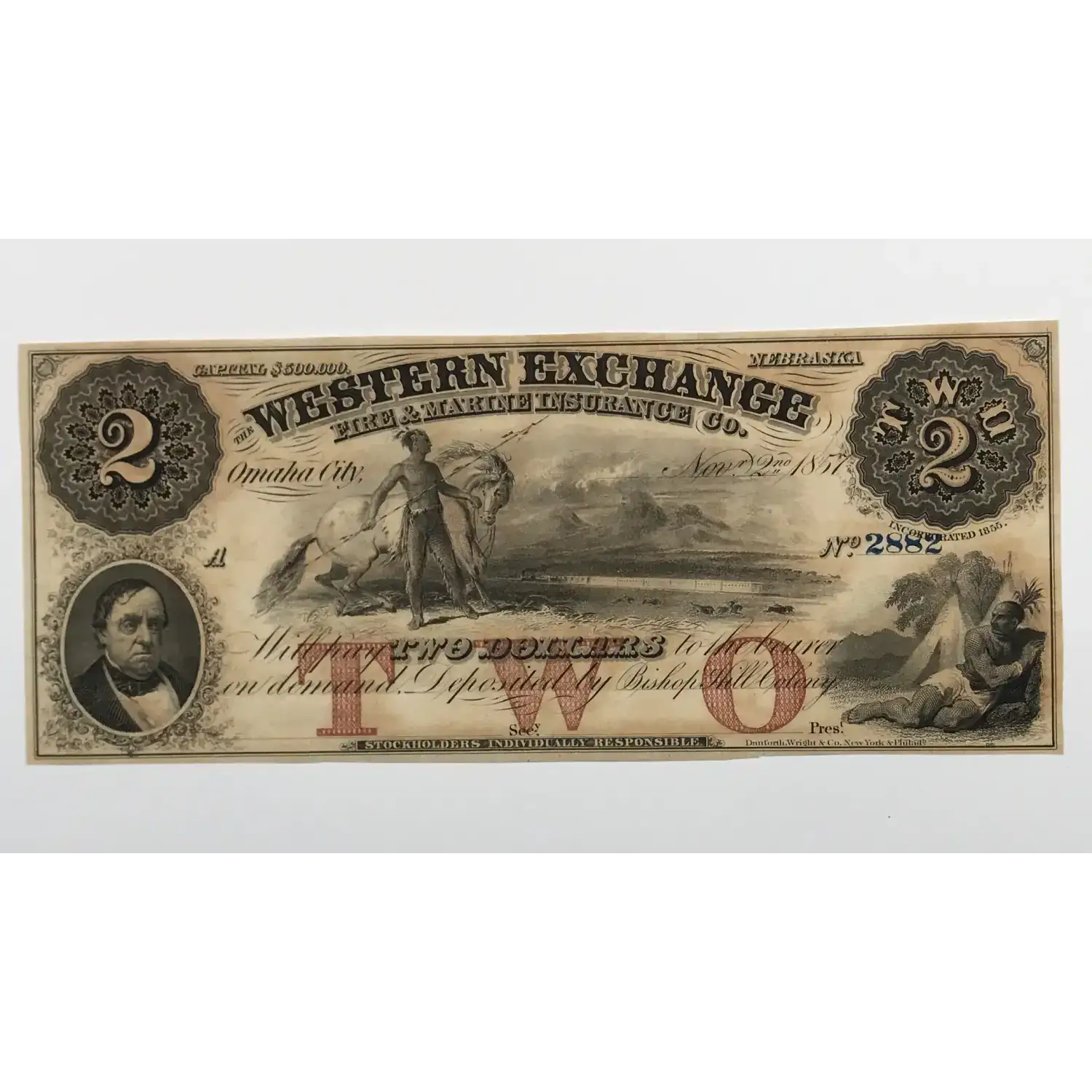 1857 Western Exchange Fire & Marine Insurance Co $2 Certificate of Deposit Note Omaha City, Nebraska (NE)