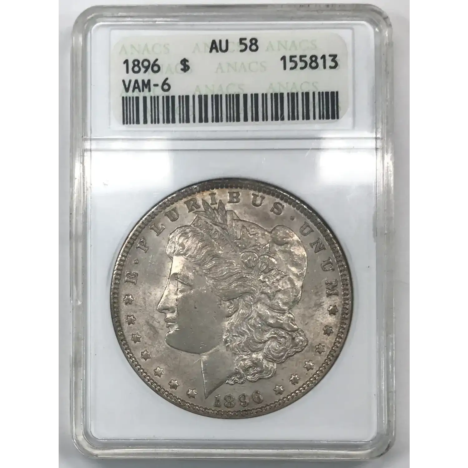 1896 P Morgan Silver Dollar ANACS AU-58 - VAM-6 Doubled 6 - old white soapbox holder