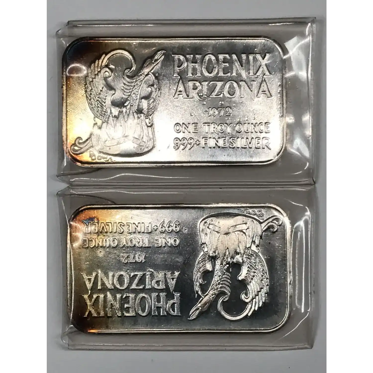 2x 1972 Phoenix Bird Phoenix Arizona 1 oz Vintage Silver Art Bar - bar/plastic has some moisture/greasiness