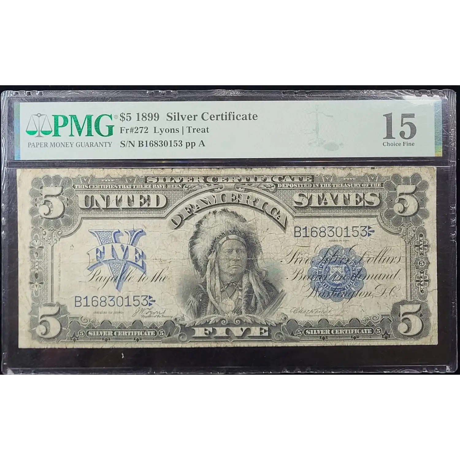 1899 $5 U.S. Silver Certificate Indian Chief Bank Note PMG Choice Fine 15 FR#272