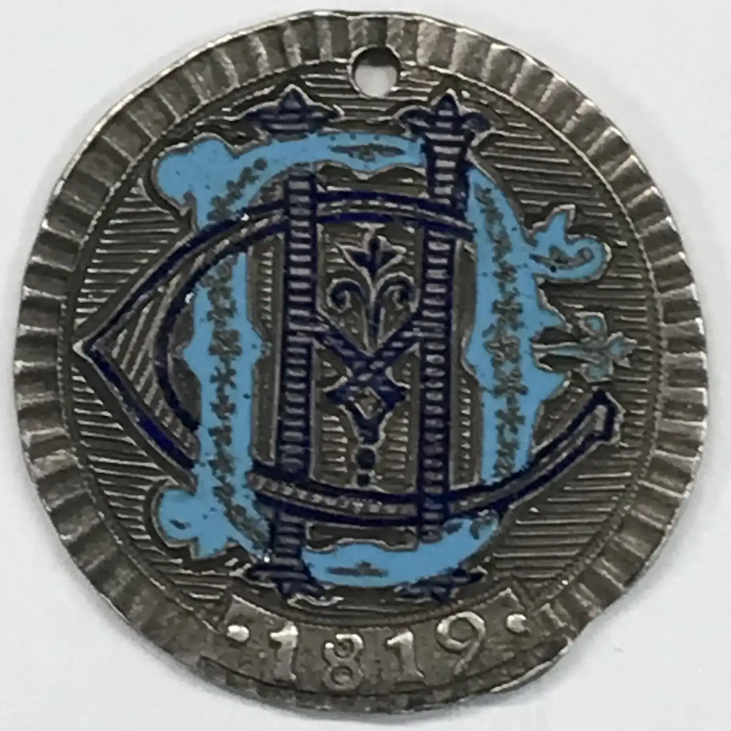 Enamel Engraved C H D Love Token/Pendant/Charm on 1819 Nueva Granada Colombia 2 Reales KM-76 - appears to be some combination of the letters C, H, D - holed for necklace/pendant/charm/etc jewelry use