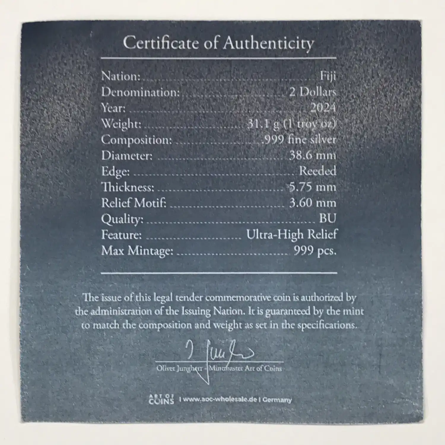 2024 John F Kennedy Ultra High Relief Fiji 1 oz Silver $2 w Box & COA - mintage 999