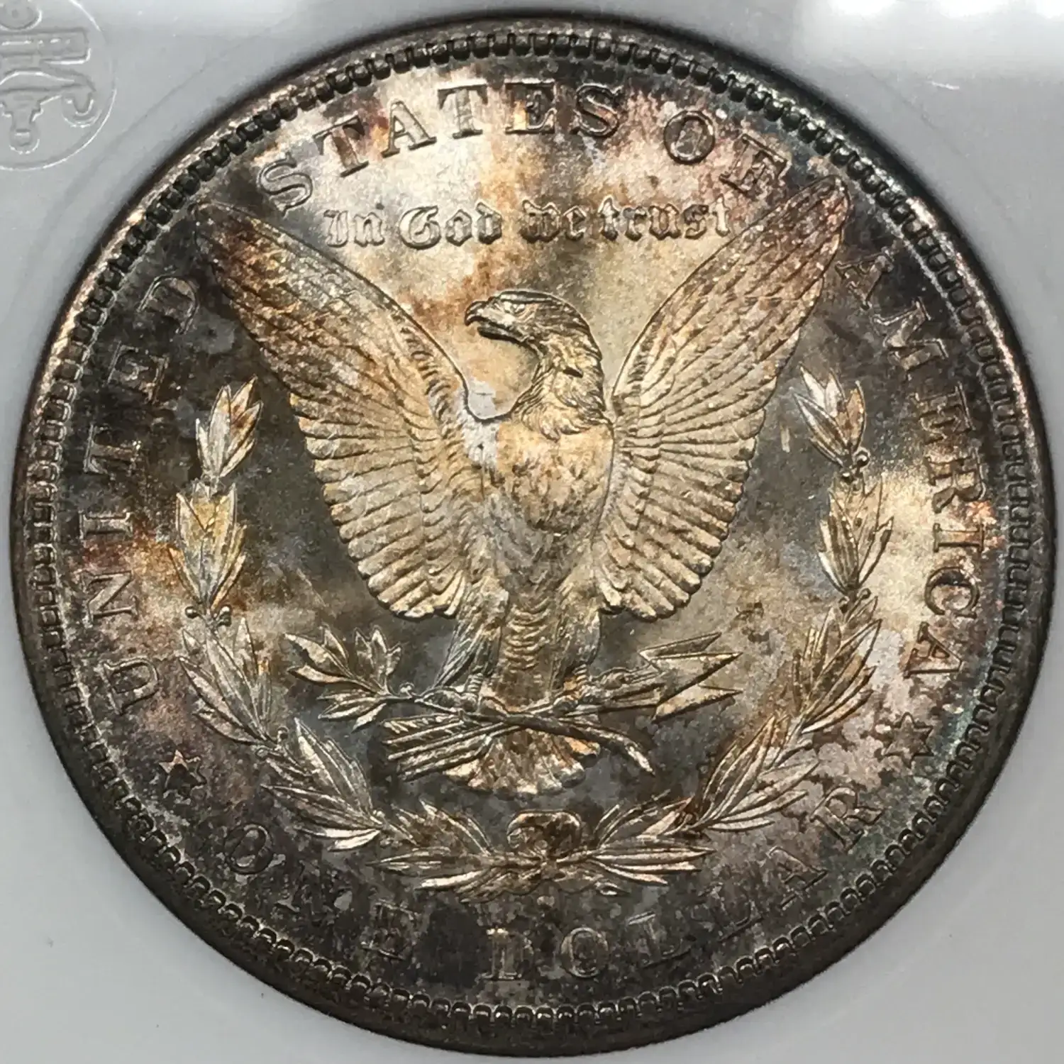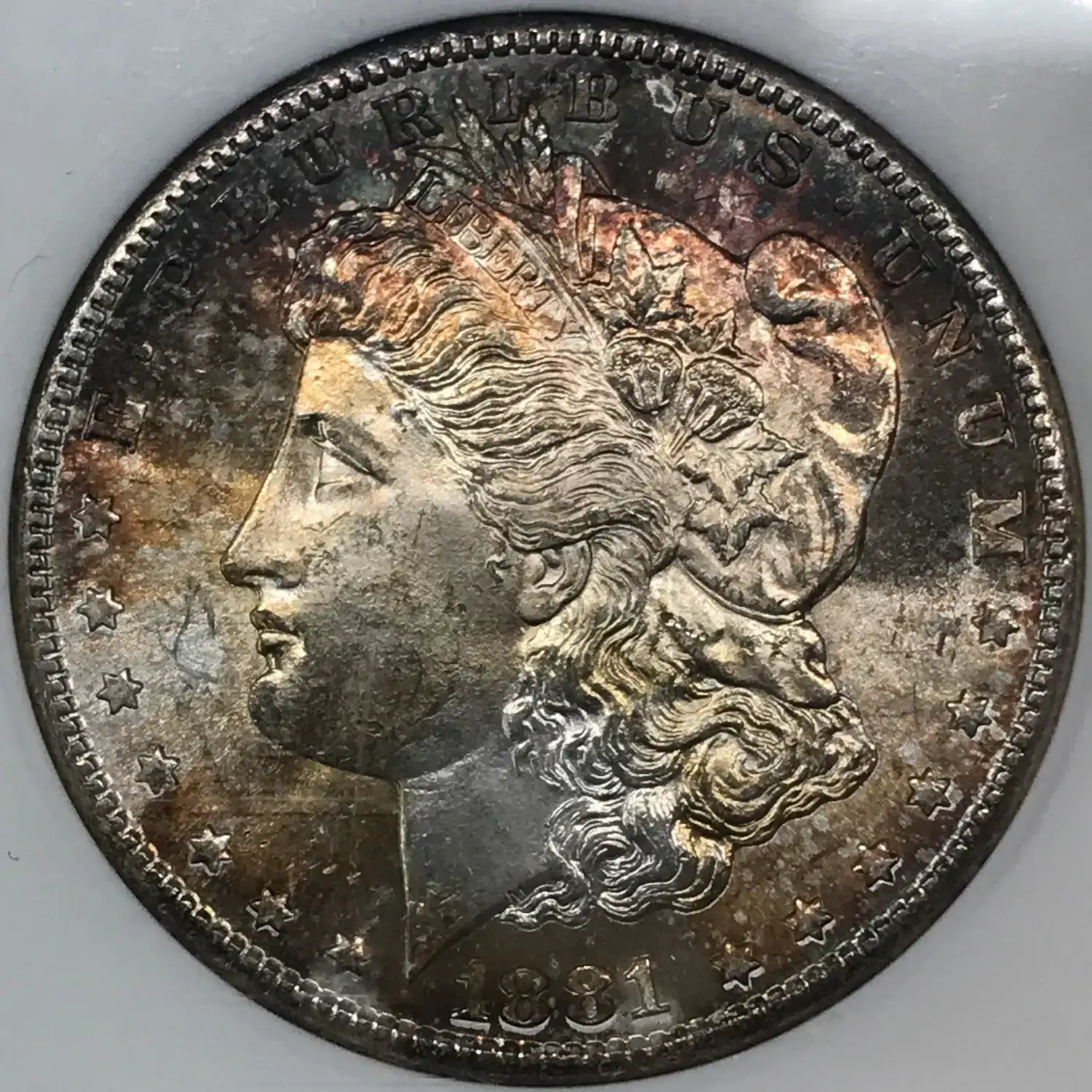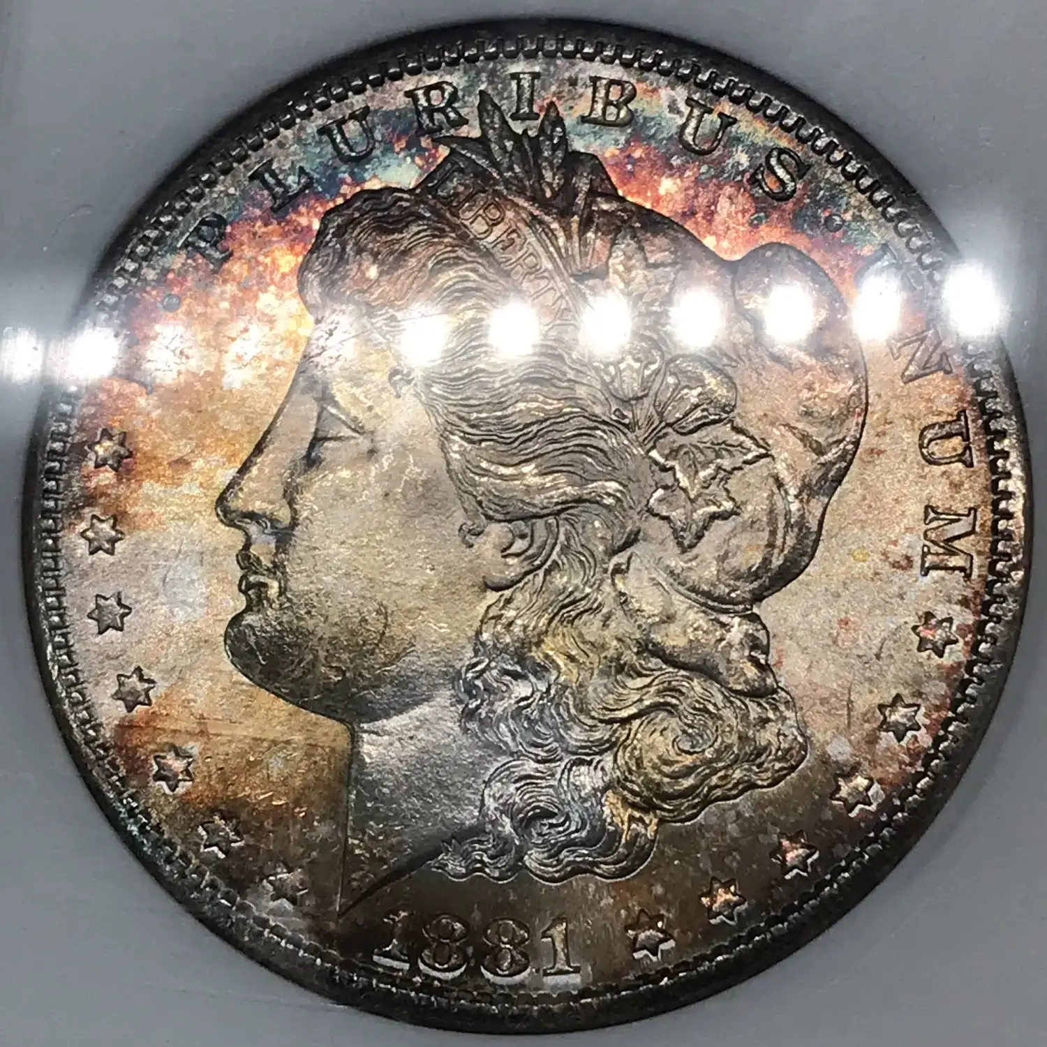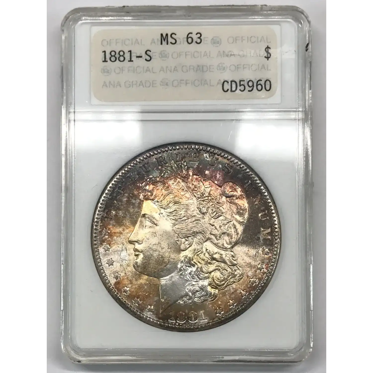 1881 S Morgan Silver Dollar ANACS MS-63 - *Rainbow Toning* - nice coin - blue ANA text old white soapbox holder