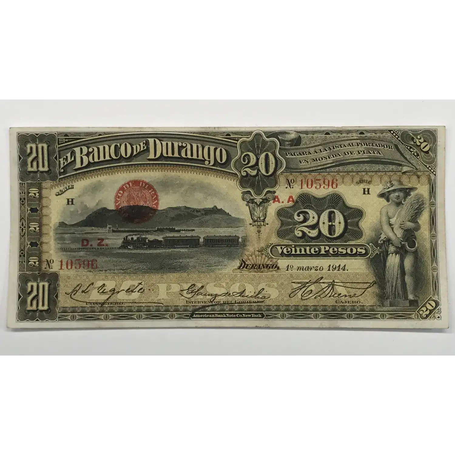 1891-1914 Banco de Durango Mexico 20 Pesos Note Series H. 1.3.1914 (BK-DUR-27) / S275h / M334c - AU - Steam Train