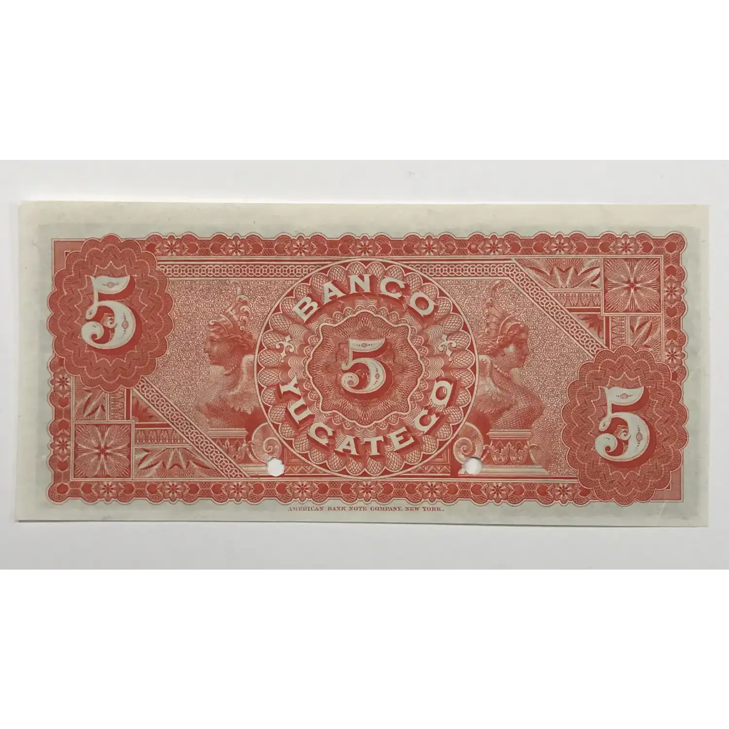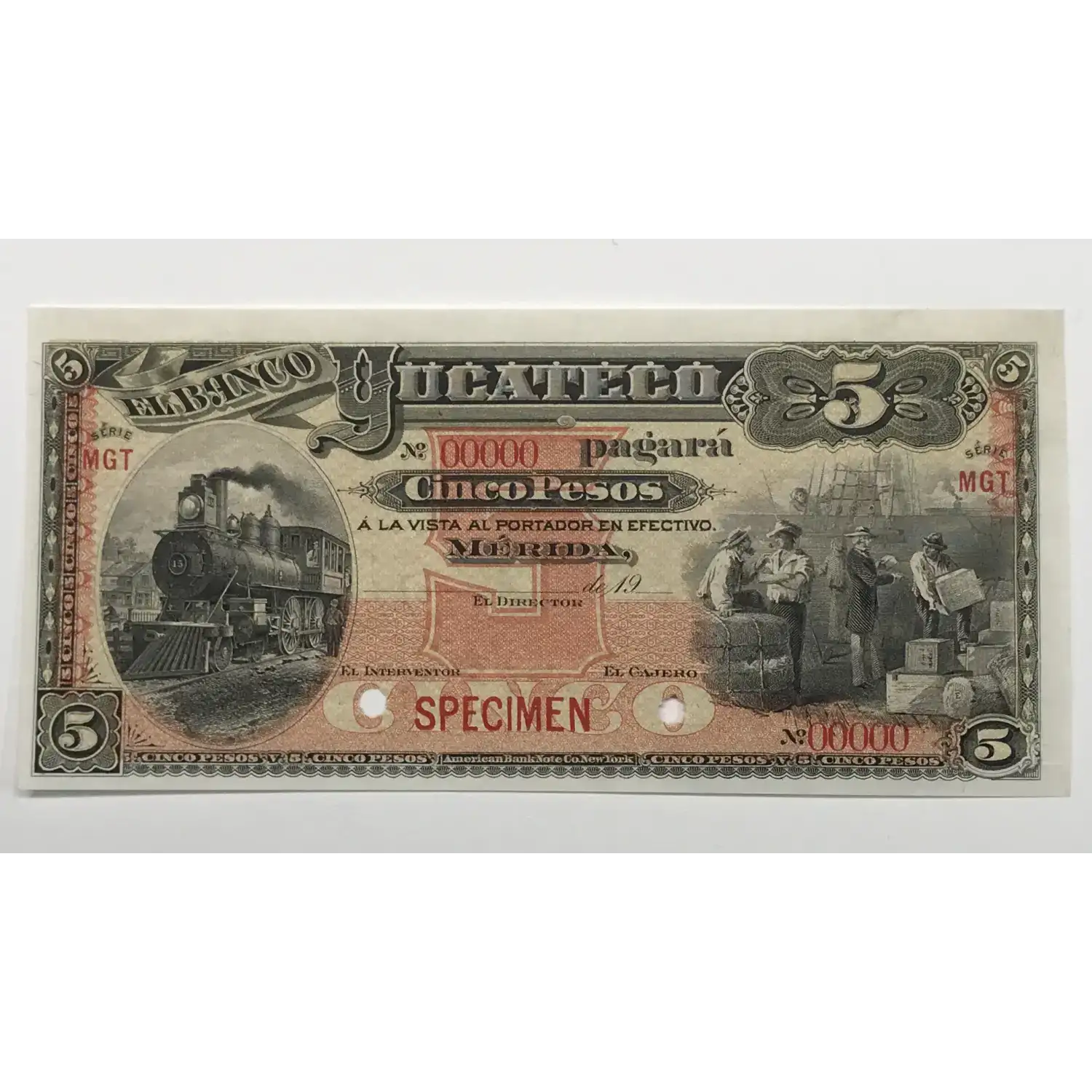 1889-1903 Issue, 19xx (ca.1903) Banco Yucateco Mexico 5 Pesos Note Specimen Series MGT - S467s4 / M5647 - CU / Uncirculated - Train Locomotive