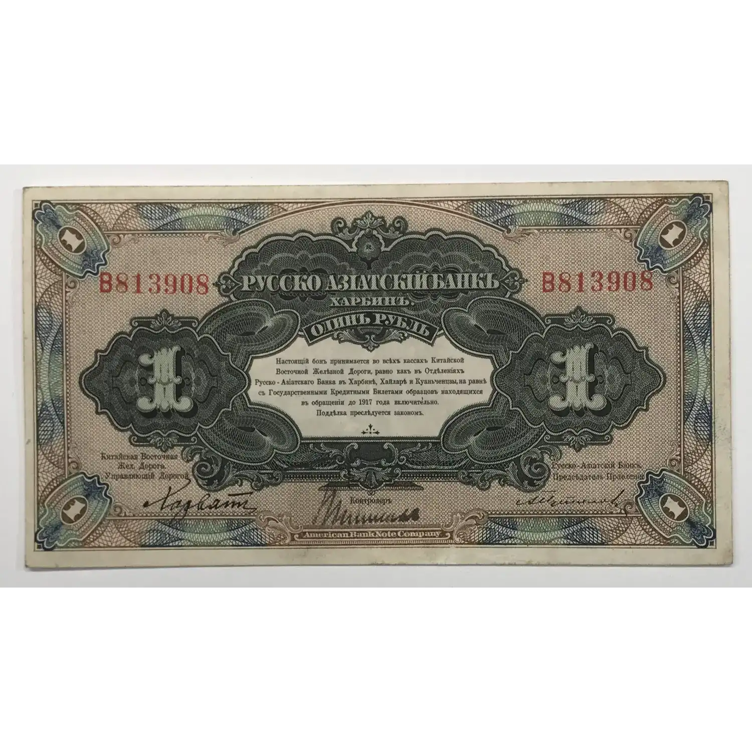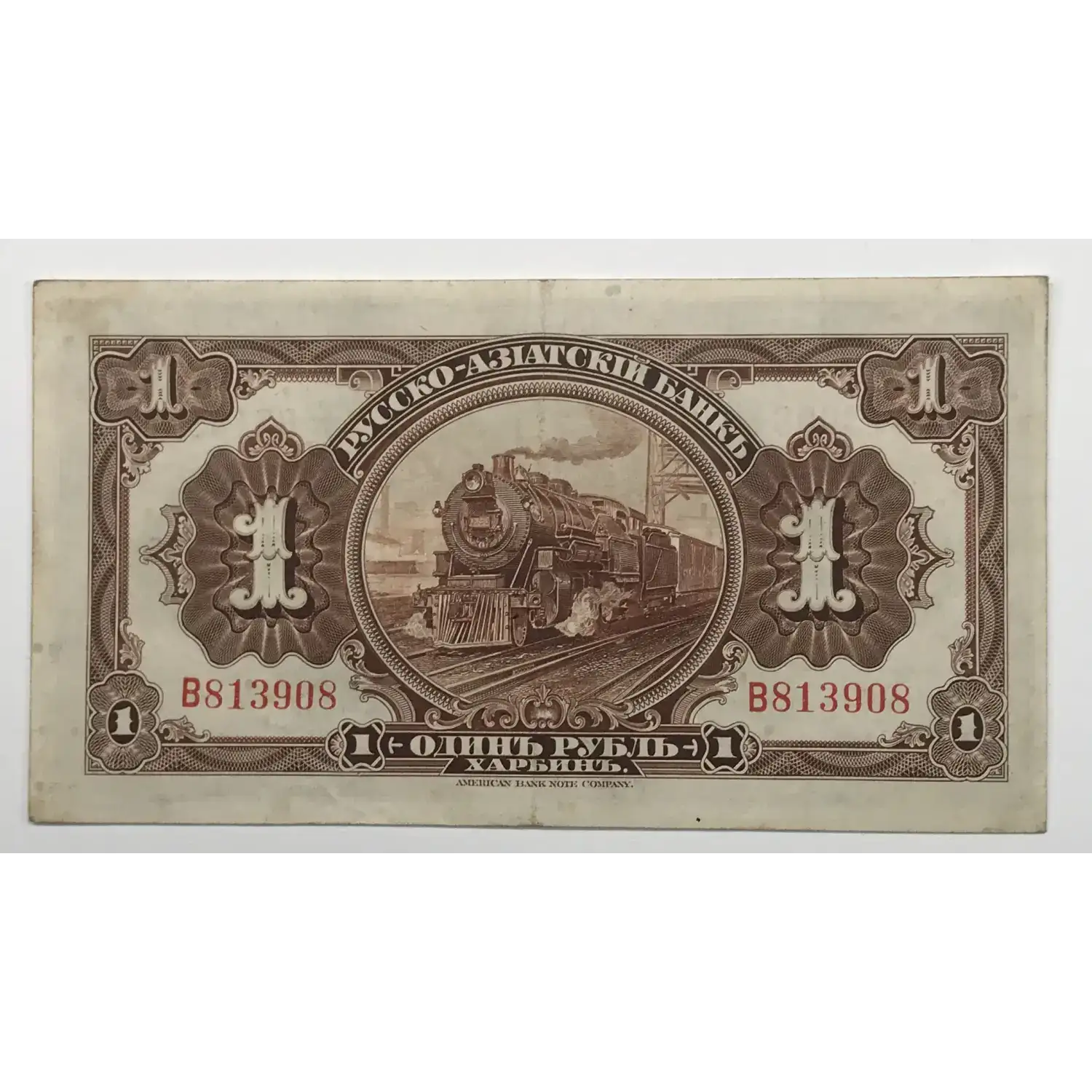 1917 China Russo-Asiatic Bank 1 Ruble Note - Pick P#S474 - Steam Passenger Train/Locomotive - XF - Issued in Harbin Branch for use by Chinese Eastern Railway - American Bank Note Company (ABNC)
