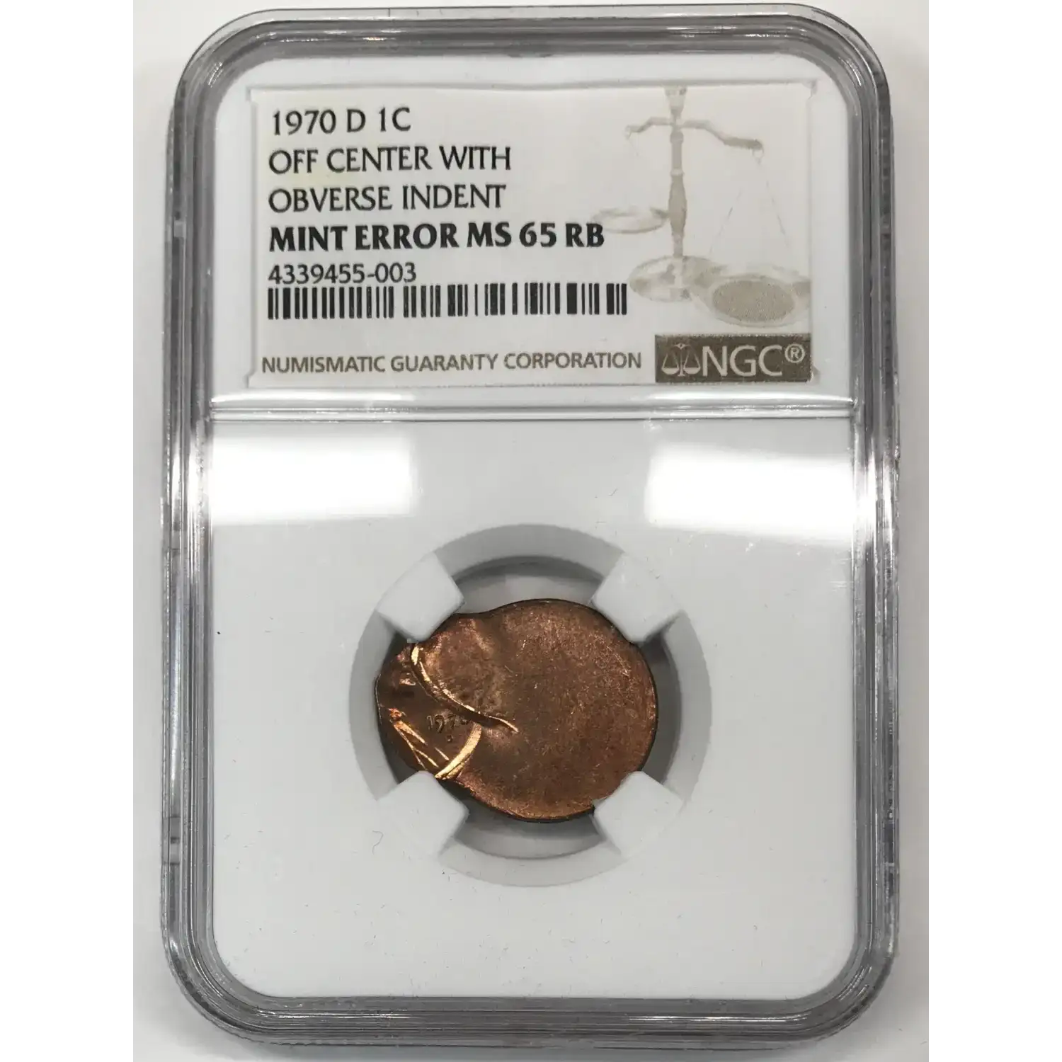 1970-D Lincoln Memorial Cent NGC MS-65 RB OFF CENTER WITH OBVERSE INDENT