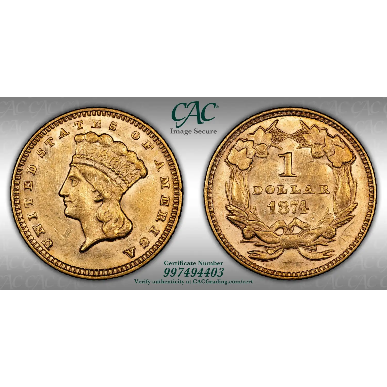 1874 Indian Princess Gold Dollar CACG AU Details Harshly Cleaned CAC