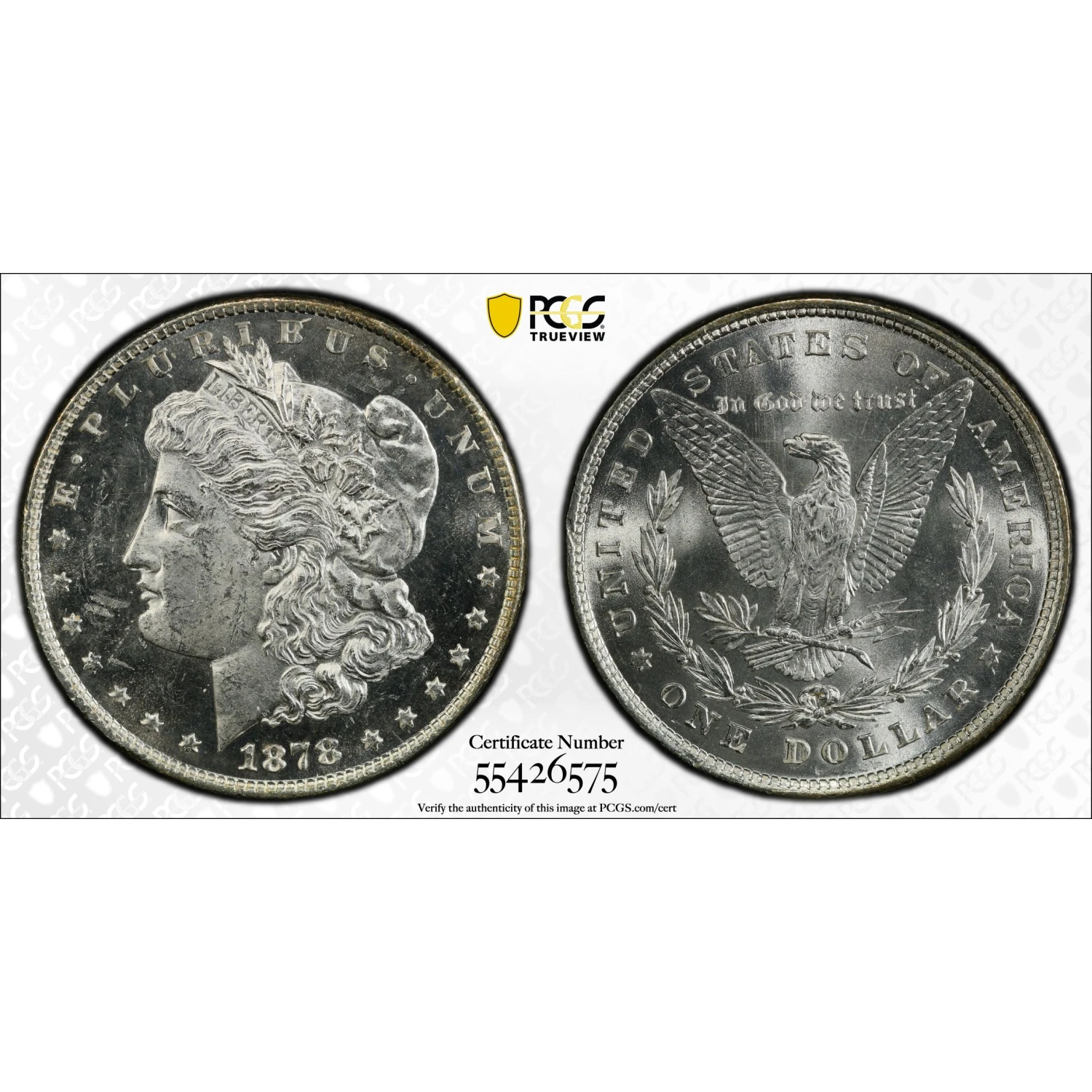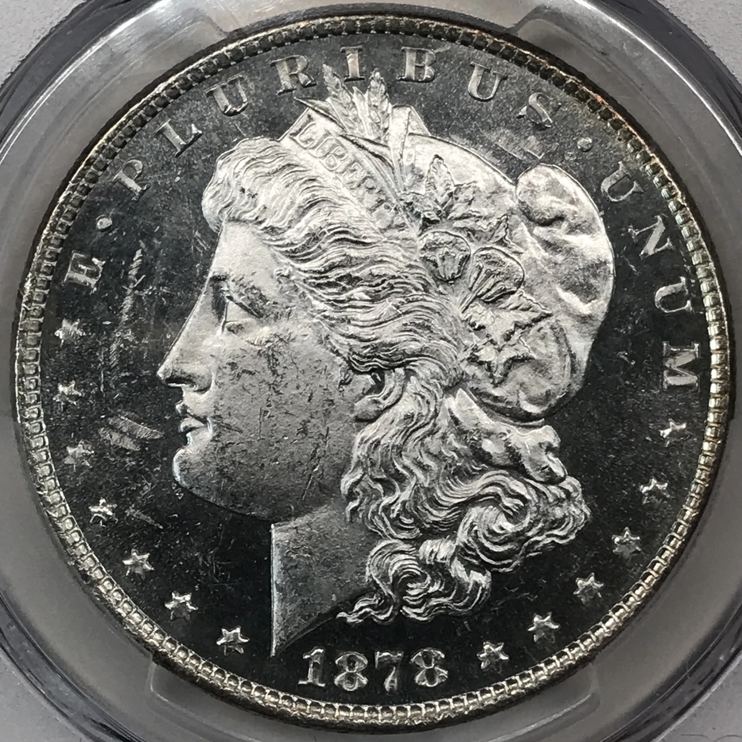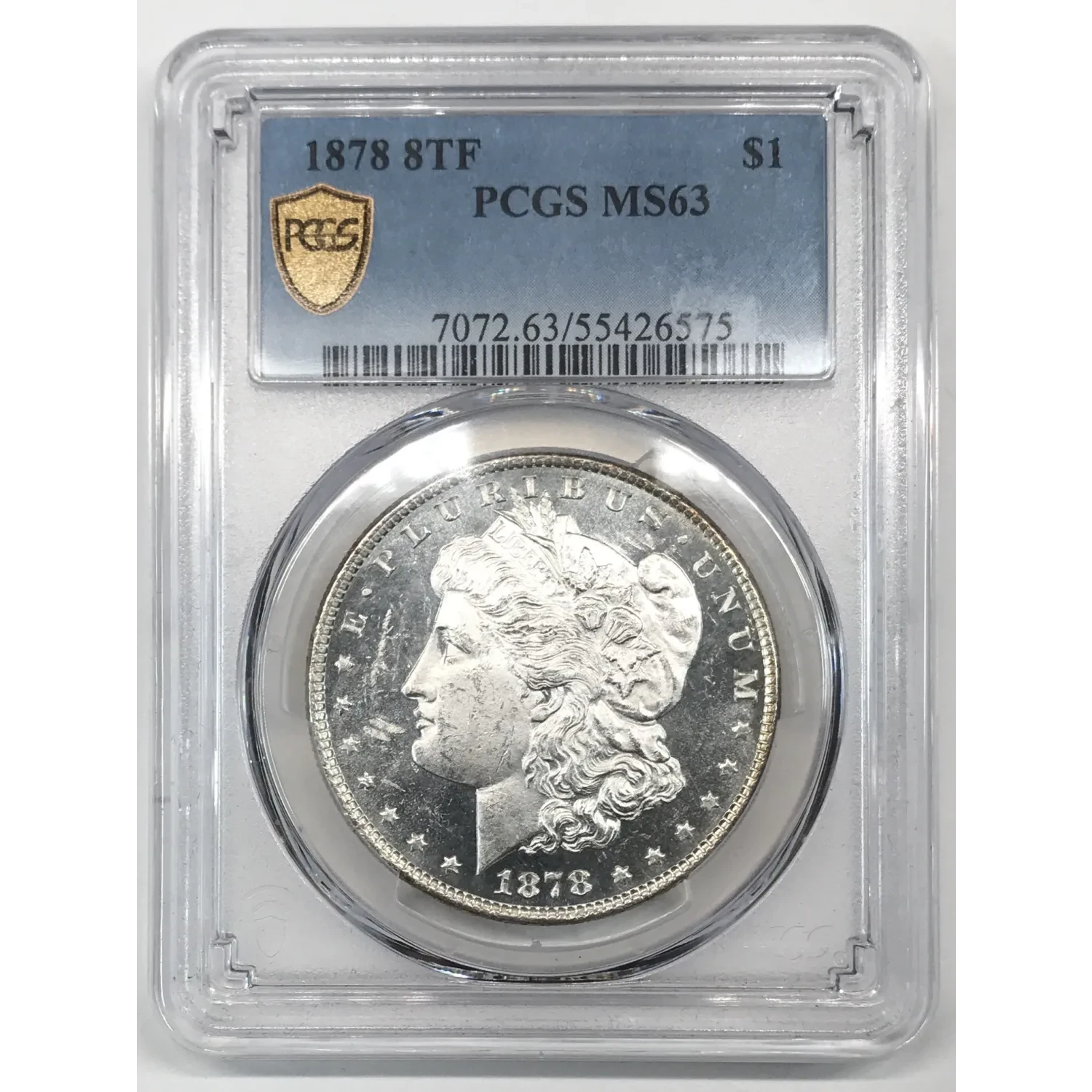 1878 P 8TF Morgan Silver Dollar PCGS MS-63 - VAM-17 Doubled Reverse, Diagonal in 8 - nice PL obverse, strong strike on reverse - DDR, nice doubling on reverse - pick up points: diagonal in 8 of date, die scratch in front of eye - 8 Tailfeathers