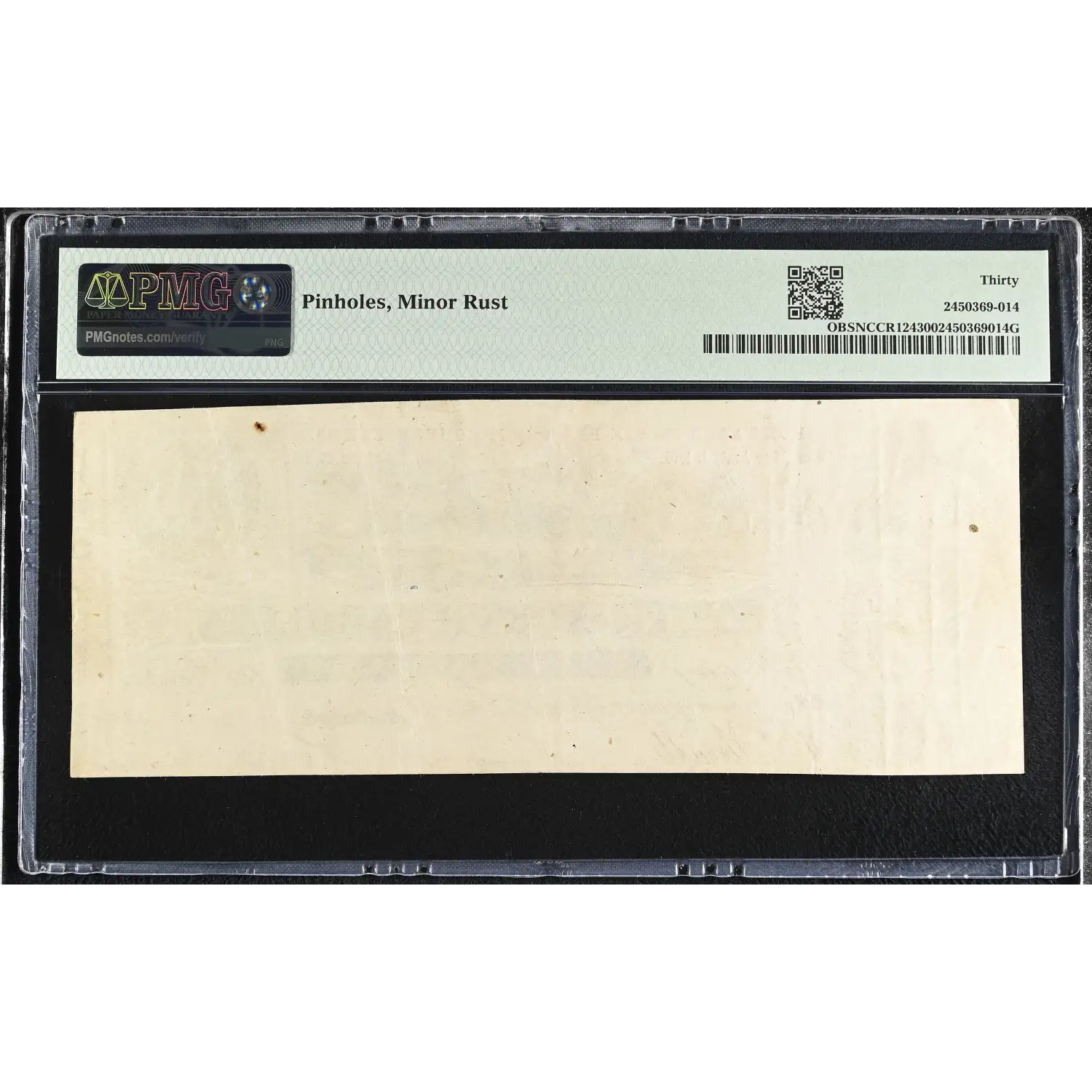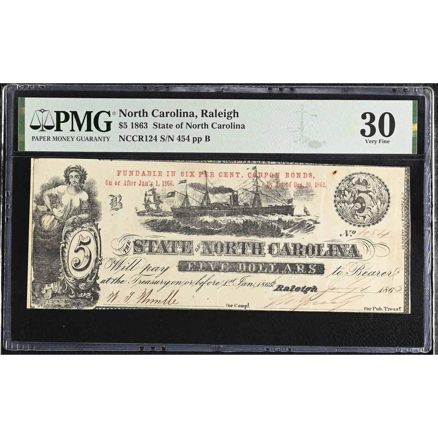 1863 Raleigh, North Carolina $5 Note NCCR124 PMG VF 30 (pinholes, minor rust)