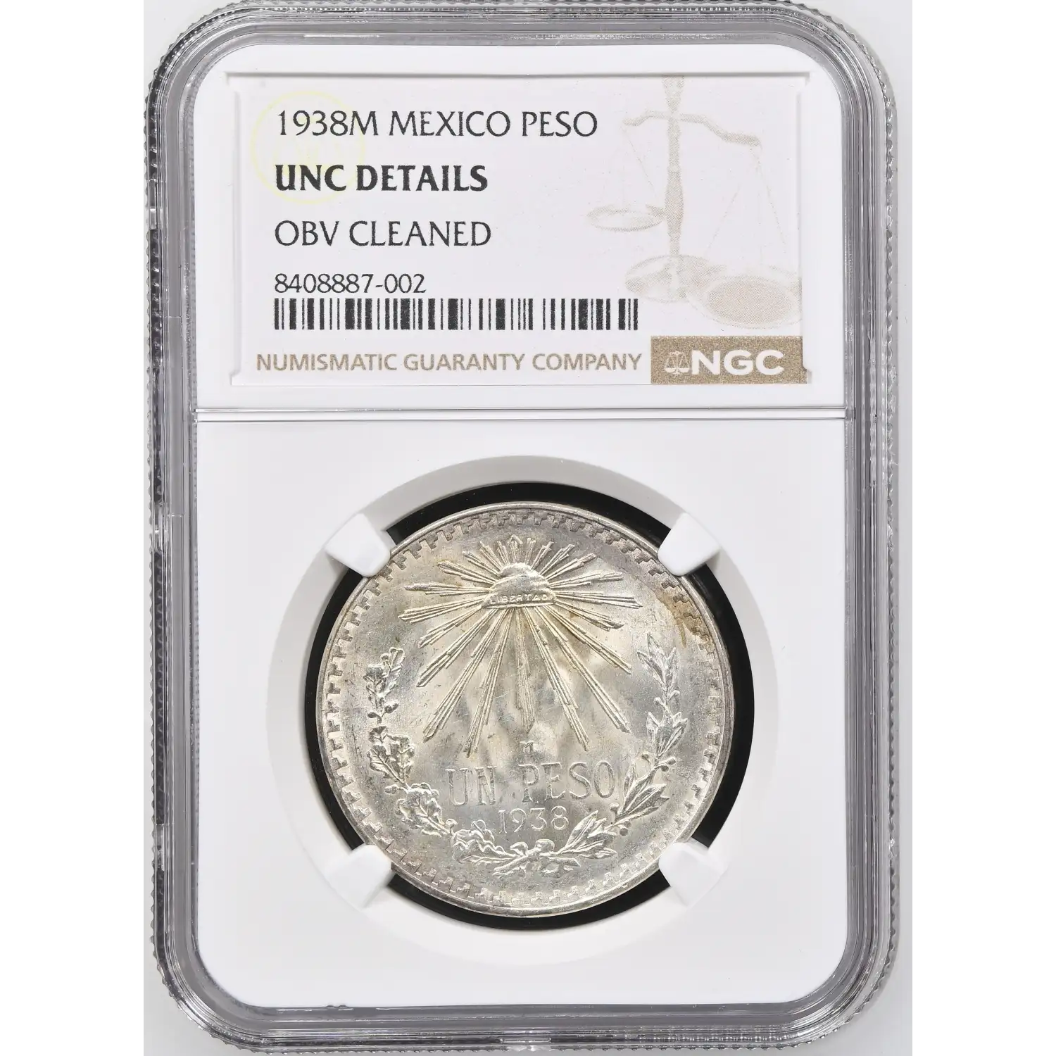 1938-M MEXICO Silver PESO NGC UNC Details (obverse cleaned) - KM#455