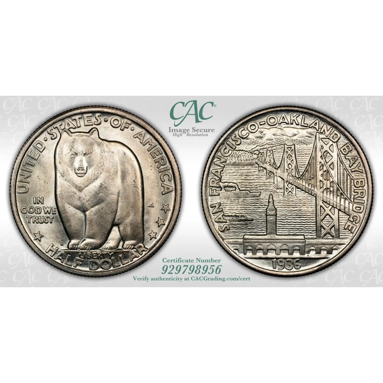 1936 S San Francisco Oakland Bay Bridge Commemorative Half Dollar CAC Grading (CACG) MS 65 - Legacy (L) Coin