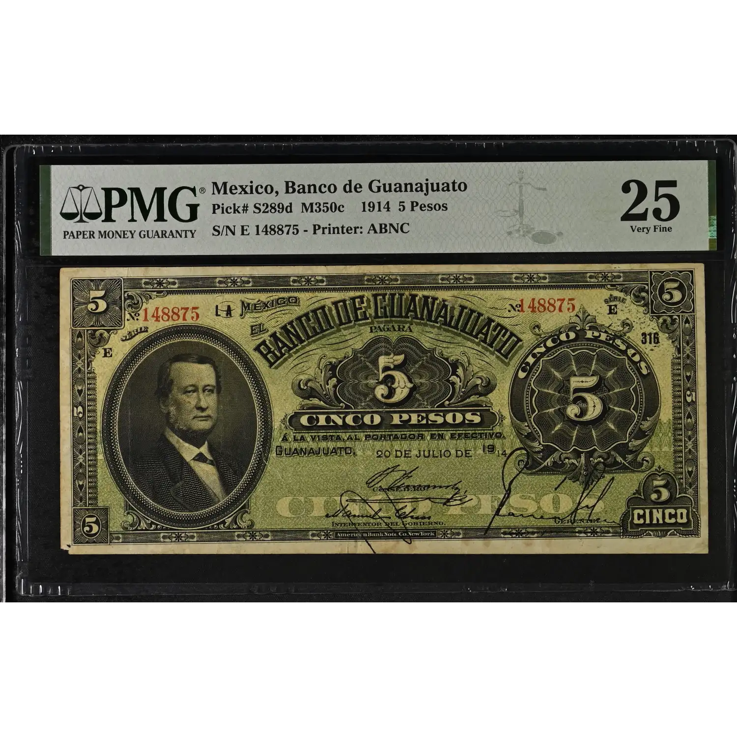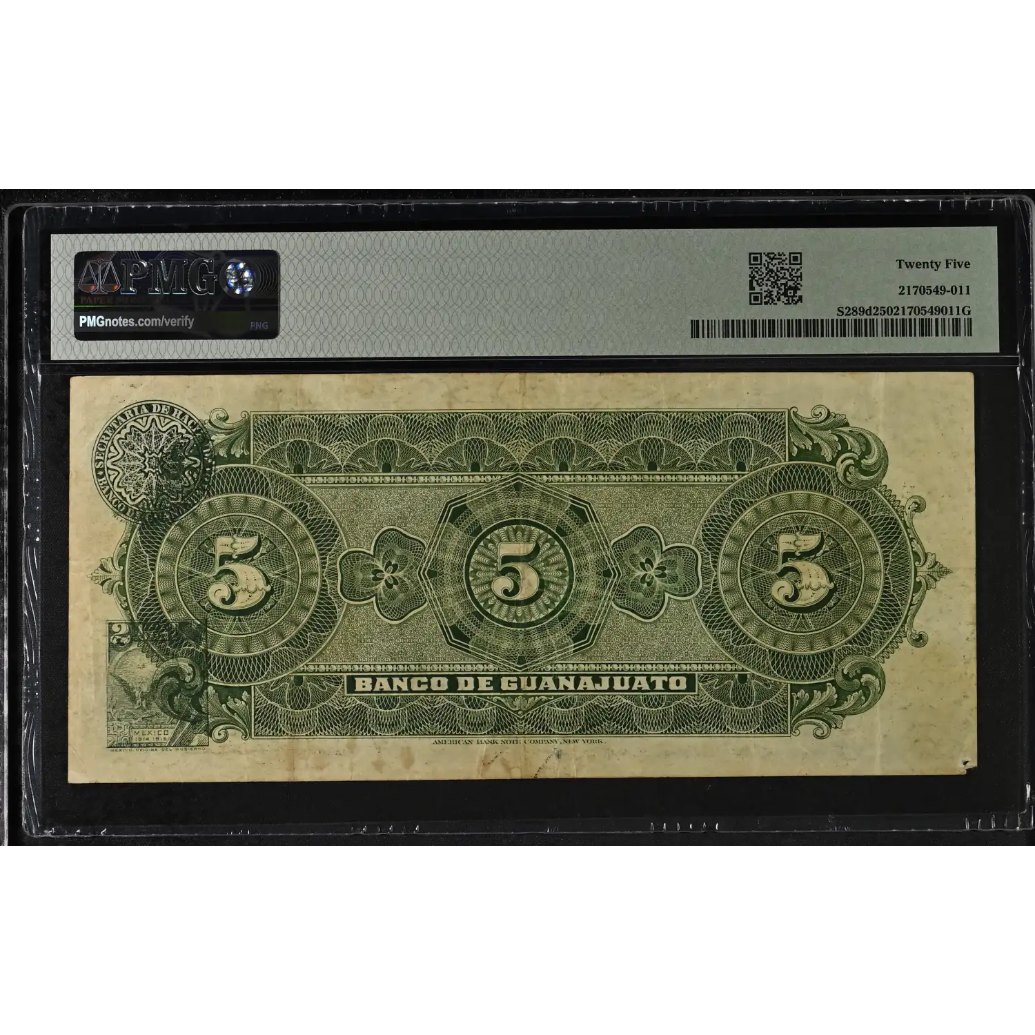 1914 Banco de Guanajuato, Mexico 5 Pesos PMG VF 25 - Pick# S289d , M350c