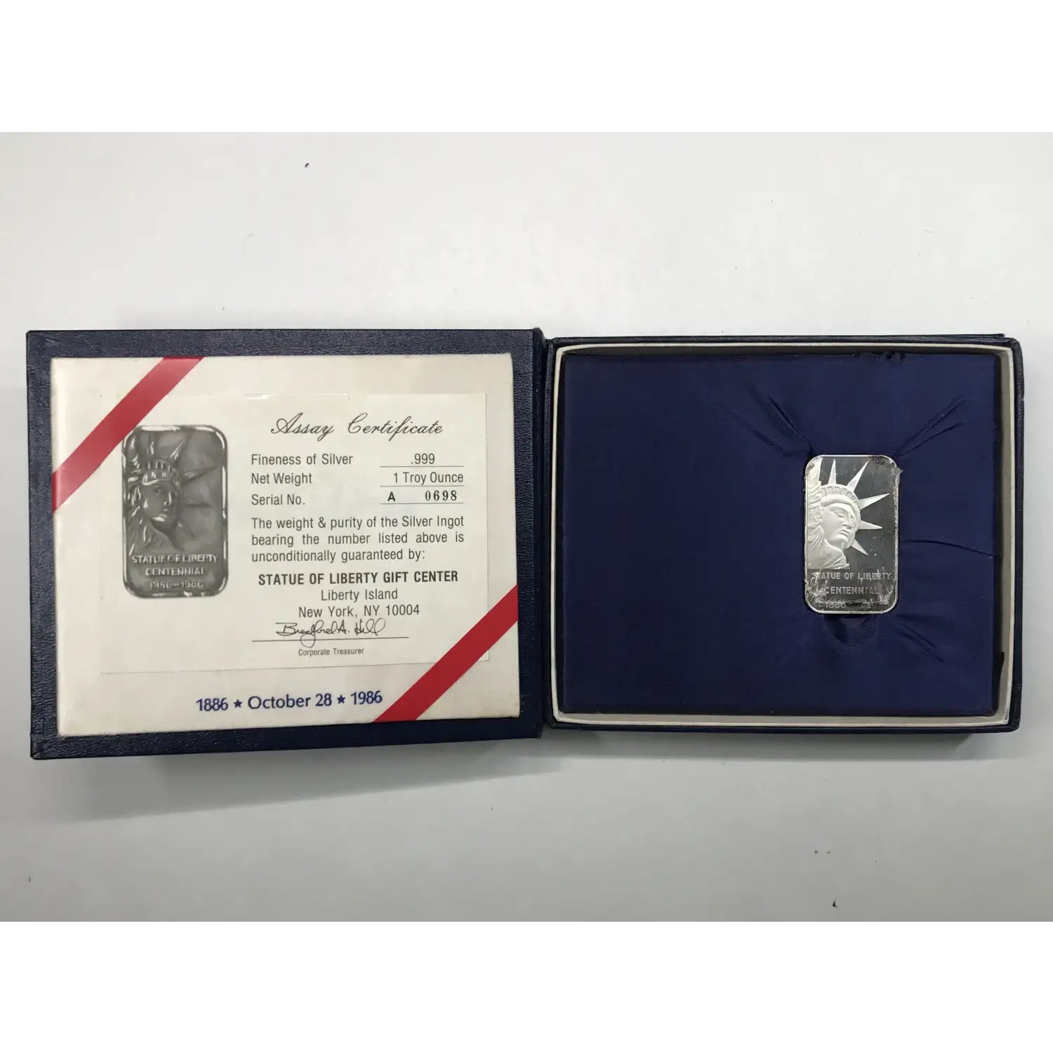 1986 Statue of Liberty Centennial 1 oz Silver Bar w Assay Certificate & Box - Commemorative Silver Ingot - nice bar, plastic wrapped