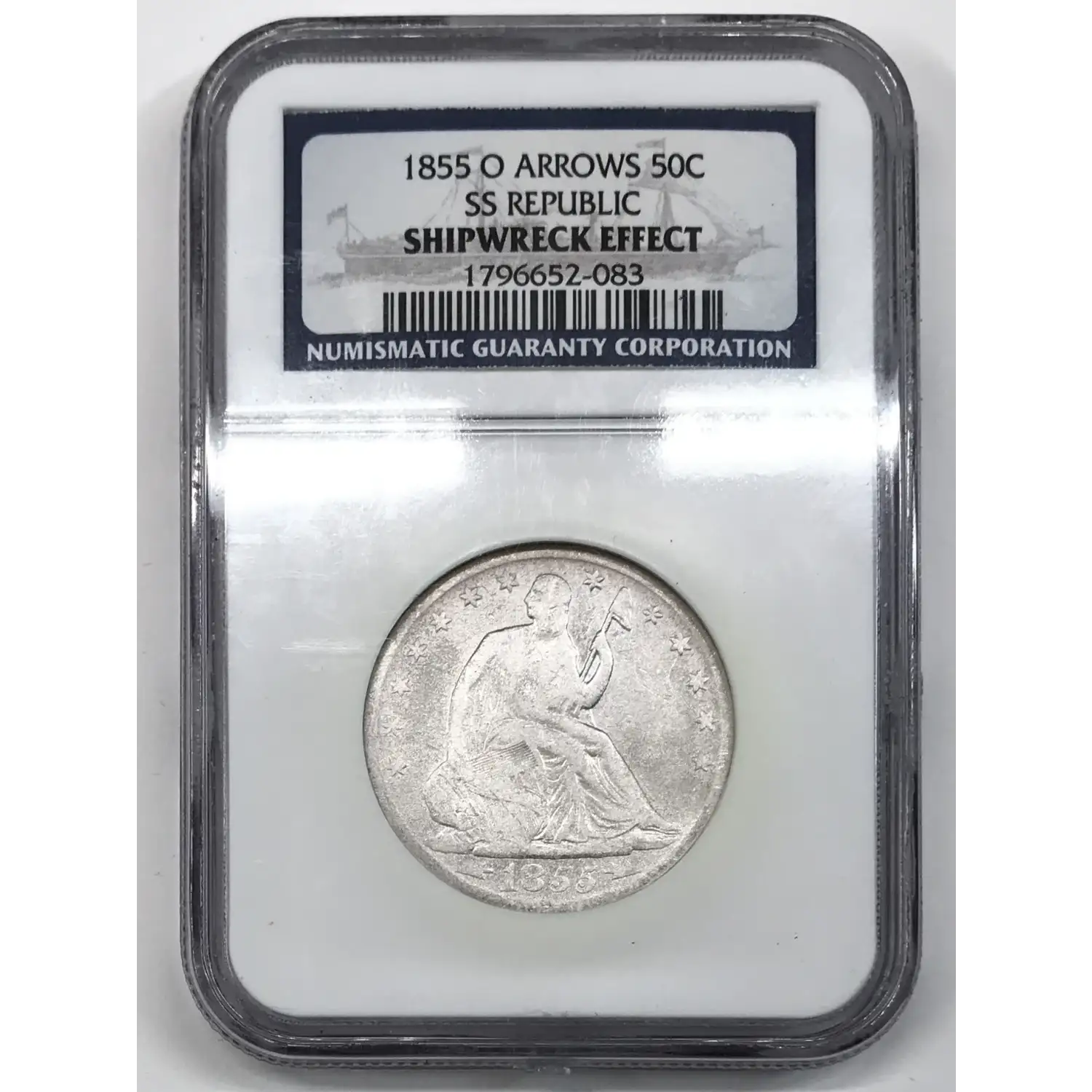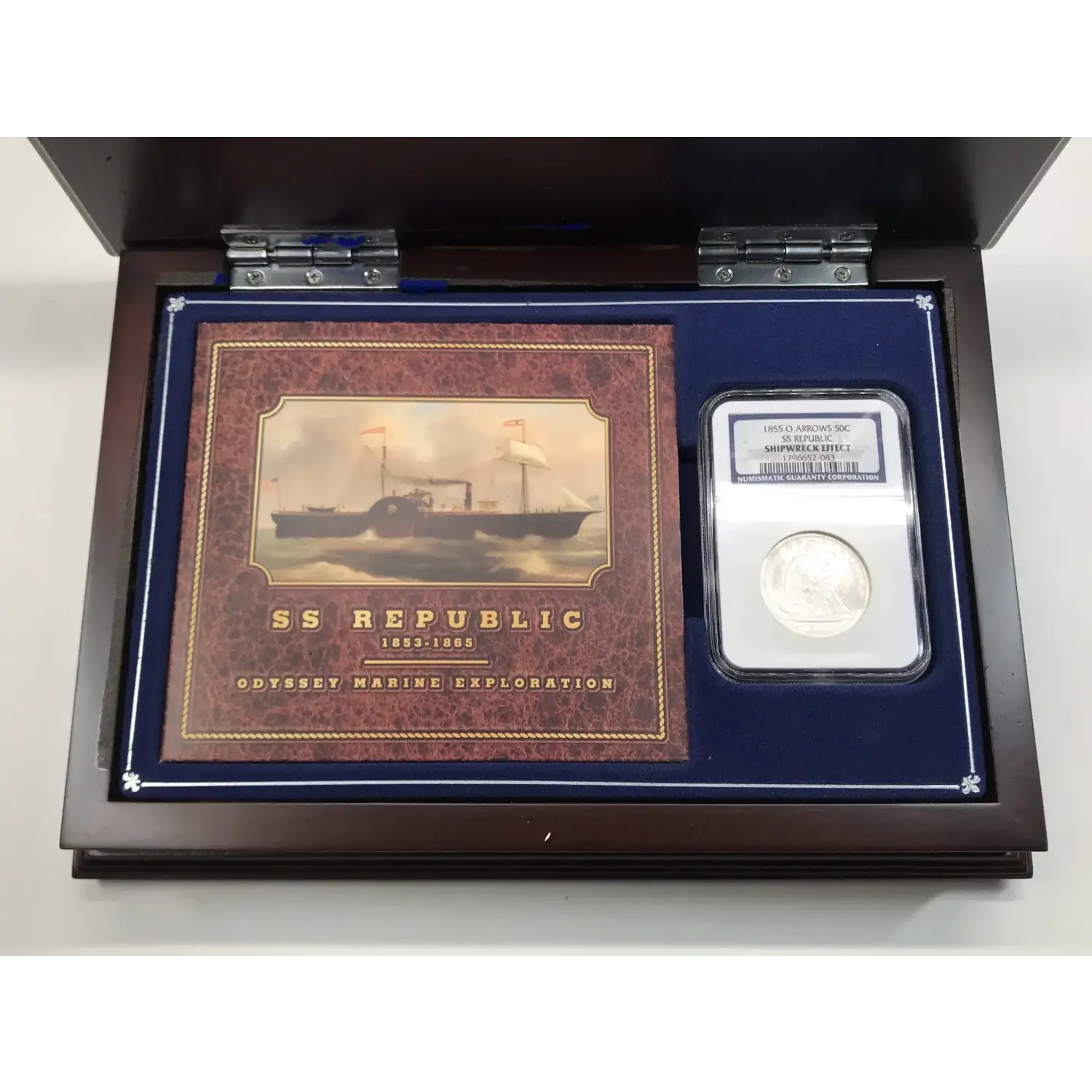 1855-O Arrows Seated Liberty Half Dollar from SS REPUBLIC NGC SHIPWRECK EFFECT w Booklet & Wooden Case (no COA)
