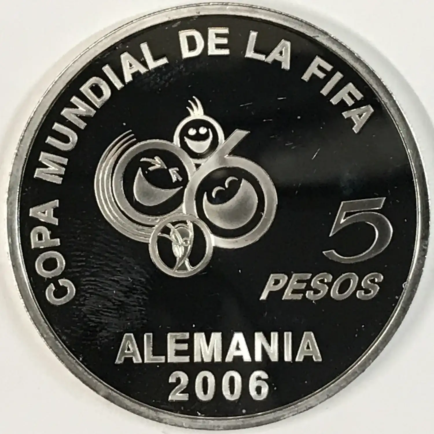 2003 Proof Argentina Silver 5 Pesos - Fifa 2006 World Cup Football/Soccer - Germany - KM#143 - 27 g, .925 fine, 0.803 troy oz Adjusted Silver Weight (ASW) - some fingerprint touchmarks