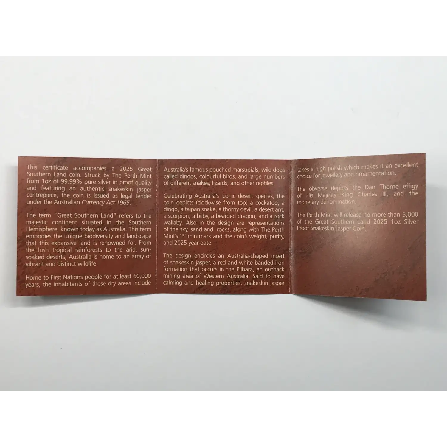2025 P Great Southern Land Snakeskin Jasper Australia 1 oz Silver $1 Coin w Box & COA - Proof Coin w Authentic Gemstone Centerpiece